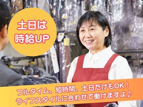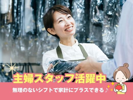 仕事内容 <女性スタッフ多数活躍中> 気軽に始められるカンタンなお仕事! 土日祝時給UP!週3日~4日勤務! 主婦(夫)さん・Wワーカーさん大歓迎! あなたに合った曜日・時間での勤務を 考慮します!扶養内勤務もOK! 丁寧なサポートで未経験でも安心! 嬉しいクリーニング割引制度もあり! 【仕事内容】 クリーニング店の受付・レジ、 衣服の仕分け・お渡し等をお任せします。 <具体的な内容> ・お客様から衣服の受付 ・工場への出荷作業 ・クリーニングの済んだ衣服の 仕上がりチェック ・お客様へ衣服の返却 <初心者さんも活躍中!すぐ覚えられる> 接客や衣服の扱い方などは研修で イチから丁寧に指導します。 難しい作業はないので、 ゆっくり丁寧な作業を心掛ければOK! 働きながら接客スキルや衣服の知識を 身に付けていきましょう! <ライフスタイルに合わせて自由に働けます!> 「第二の人生を楽しみたい!」 「子供の手が離れて、時間が出来た」 「年齢は高めだけど、元気だしフルタイムで働きたい」 「新しく色々覚えるのは難しそうだから、 自分でもすぐできる仕事だといいな~」 店舗で働いている60代女性スタッフは、 「子供が独り立ちしてから家で旦那と二人で、 時間も余裕だしパートしたいな~と思ってたの。 年齢が高めだから断られちゃうことも多かったんだけど、 まだまだ元気だしフルタイムで働きたくって! クリーニングって家事の知識活かせるし、 常連さんも多くて楽しいから週5で勤務しちゃってるわ~」 と、話してくれました! 衣服を扱うクリーニング店では 家事の知識・経験をすぐに活かせます! 「今まであんまり仕事探しをしたことなくて」 「新しい知識をいれるのも不安」 そんな心配はいりません! あなたの経験が必要な職場なので、 ぜひ当社で第二の人生を始めてみてください!
