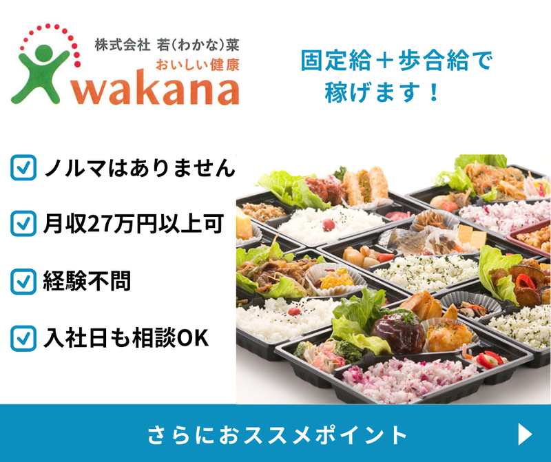 求めている人材 \こんな方にピッタリ!/ □ コミュニケーションが得意な方 □ 正社員として安定して働きたい方 □ 車の運転が好きな方(AT限定OK) □ 営業未経験でもやる気がある方歓迎! 【ここが魅力!】 ◎ノルマなし!プレッシャーなく働ける ◎歩合で収入アップも可能 (契約食数で変動) ◎無料のお弁当あり=月の昼食代が0円!