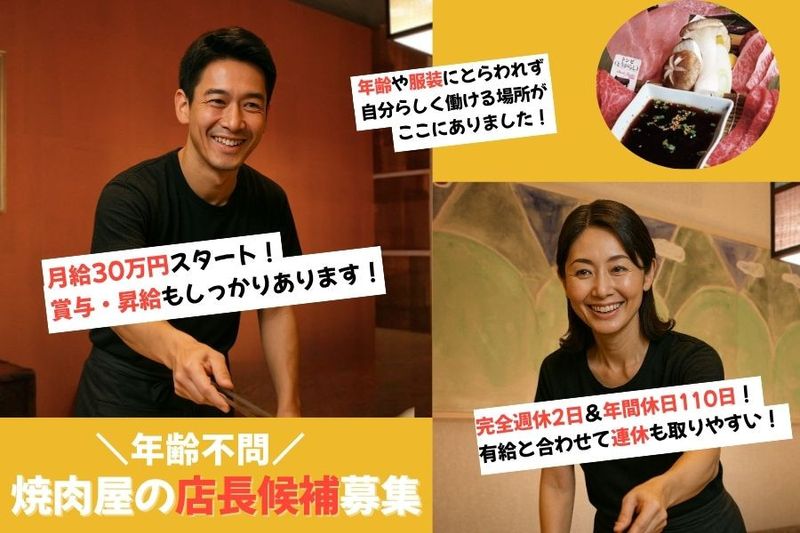 【アピールポイント】 ⭐枠にとらわれず、可能性を広げたいあなたへ。 「挑戦したい」という気持ちを、全力で応援します! ✅月給30万~でガッツリ稼げる ✅完全週休2日制×残業なし ✅服装・髪型自由で、自分らしく働ける 本店はアーケード内にあるので、雨の日も濡れずにラクラク出勤! 駅からも近く、通いやすさも抜群の好立地です⭕️ ■お電話からのご応募・お問い合わせ 【和牛焼肉ぱんが本店】 TEL:090-2728-8967