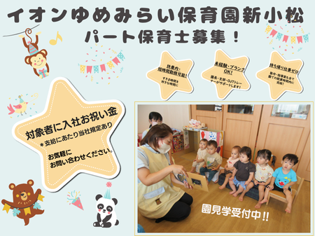 【勤務先】 イオンゆめみらい保育園新小松 【勤務地】 石川県小松市清六町315番イオンモール新小松1F 【勤務地】 石川県小松市清六町315番イオンモール新小松1F