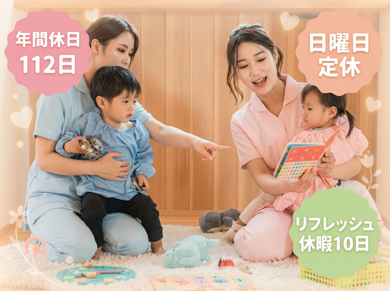 仕事内容 \ ここに注目! / ◎リフレッシュ休暇10日あり ◎病気でお休みしても給与が 減額されないよう制度を整えています ◎年間休日112日、日曜定休日 ◎月給33万円スタート可能 ◎UIターン歓迎、遠方からの応募歓迎 ◎保育を通じて地域社会に貢献 保育士経験・資格を活かして 働きやすい環境で 再スタートしませんか? ―――――― 仕事内容 ―――――― 病院内に併設された保育室で 0~2歳の未満児への保育をお願いします。 勤務地にもよりますが、2~3クラス編成で、 1クラスあたり2~3名の職員体制です。 (定員は約20名となります) 主に医療従事者のための保育室のため、 お母さんやお父さんが近くにいる ことも私たちならでは。 どうしても泣き止まない、という時の対応や 申し送りなどもしやすいことも魅力です。 一般的な保育全般の他に、 昼食やおやつの補助などもあります。 また園にもよりますが、 イベントは自発的な遠足のほか、 保護者の保育参加として クリスマス会があります。 ―――――――――――― こんな方にもピッタリ ―――――――――――― ・保育経験が浅い方 ・ブランクがある方 ベテランの先輩たちが 丁寧に業務をお教えしますので、 安心して活躍できる環境です。 保育士としてスキルを磨いていきたい方も まずは気軽にご応募ください。 また子育てと両立して働く ママさんも活躍しています。 お子様の体調不良や行事などの際は 柔軟に対応しますのでご安心ください。 ―――――――― 職場の雰囲気 ―――――――― 職員同士の連携が強く、 なんでも相談しやすい雰囲気です。 明るく落ち着いた園内で、 子どもたちものびのびと過ごしています。 ―――――――――――― ワークライフバランス ―――――――――――― 年間休日112日で日・祝が定休日です。 その他の曜日はシフト制で決めていて、 原則として全体の希望を考慮しながら、 シフトを調整させていただいています。 子育てや介護にも配慮しており、 時短勤務のご相談も承っています。 毎年リフレッシュ休暇を10日支給しており、 趣味や家庭とも両立しやすい職場です。 ―――――――――――― NPO法人きらりの特徴 ―――――――――――― 保育は子どもの命と健康を守り、 安全に活動できるように養護すると共に、 心身を健全に発達させるよう、 教育することだと考えています。 また保育園は、保護者様の代わりに 子どもたちの成長をサポートする場所。 「もうひとつのおうち」を目指しています。 そのために「私たちには何ができるか」を スタッフ全員で常に考えています。