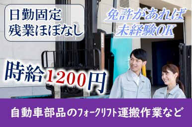 仕事内容 ◆大手メーカー内のフォークピッキング・梱包スタッフメリット満載の新案件です!!◇キレイな工場で快適に働いてみませんか? <仕事内容> ■大手自動車部品メーカーの製品倉庫内での作業 部品のピッキング・フォークリフトでの移動運搬・仕分け・個数の検品・伝票貼り等の入荷・出荷にかかる簡単な準備作業を手伝って頂きます。 (重量物はフォークリフトを使用) 製造のラインと違うところは、自分のペースや段取りで仕事を進めていくところです。 ライン作業が苦手であったり、動きがある作業が自分には向いてる!という方にオススメの職場です。 立ち作業でのお仕事です。 重量物を扱う(15㎏以上)可能性がございます。 個人作業となります。 ≪職場環境≫ 空調完備で年間通して一定の室温が保たれた綺麗な職場です。 休憩室完備 アピールポイント <仕事内容> ■大手自動車部品メーカーの製品倉庫内での作業 部品のピッキング・フォークリフトでの移動運搬・仕分け・個数の検品・伝票貼り等の入荷・出荷にかかる簡単な準備作業を手伝って頂きます。 (重量物はフォークリフトを使用) 製造のラインと違うところは、自分のペースや段取りで仕事を進めていくところです。 ライン作業が苦手であったり、動きがある作業が自分には向いてる!という方にオススメの職場です。 立ち作業でのお仕事です。 重量物を扱う(15㎏以上)可能性がございます。 個人作業となります。 ≪職場環境≫ 空調完備で年間通して一定の室温が保たれた綺麗な職場です。 休憩室完備 \充実した福利厚生/ ◎社会保険・雇用保険完備 ◎有給休暇有・残業手当 ◎交通費支給(規定内) ◎確定拠出年金制度 ◎週払い制度(週3回対応) ◎お友達推薦制度あり(規定有り) ※1名につき3万円~10万円臨時給与として支給 ◎職場見学あり ◎車(マイカー)・バイク通勤可(無料駐車場あり) ◎社員食堂 ◎休憩室完備 ◎作業服貸与 ◎冷暖房完備 ◎食堂完備(1食250~300円程度) ◎食事持参可 ◎ロッカー・休憩室利用可 ◎売店・ATM有り ◎福利厚生プログラム (宿泊、グルメ、ショッピングなど大幅割引が受けられる10万アイテムのメニューがあります。)