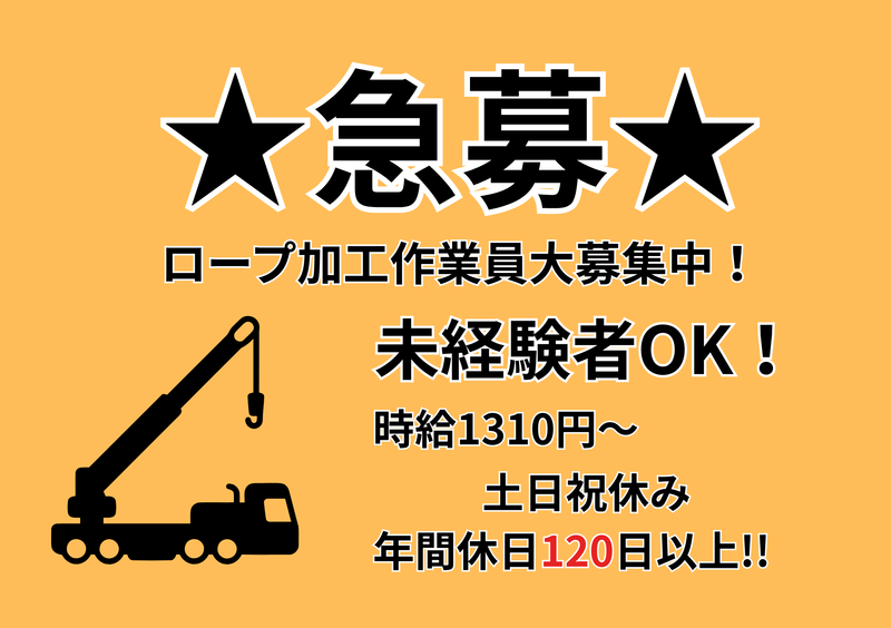 仕事内容 【未経験OK/急募!】 ロープの組立・加工スタッフ募集 <お仕事内容> 切断されたロープの端を亜鉛で固める加工を行うお仕事です。 シンプル作業が中心なので、未経験の方も安心してスタートできます! ◎作業内容は配属により下記いずれかです。 ① 日勤/端末加工 ロープの端を亜鉛で固定する仕上げ作業 ② 交替勤務/プレテン作業または切断作業 ロープの加工・切断などの工程を担当 ※適性や希望を考慮します。 【未経験でも安心の理由】 ・作業・安全面ともに、理解できるまで丁寧にサポート ・分からないことはすぐ聞ける環境です◎ ★玉掛・クレーン資格をお持ちの方は優先採用! (資格がなくても応募OK) 【この職場のおすすめポイント】 ✔ 作業後はお風呂のあるのでスッキリ終業! └ 汗を流して、気持ちよく帰宅できます ✔ 事前に職場見学OK └ 雰囲気・作業内容を見てから決められるので安心 ✔ 急募につき今がチャンス!