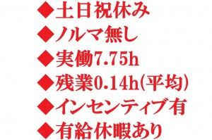 勤務時間 ■勤務時間:8:45~17:30(休憩60分、実働7.75h) ■ほぼ残業なし(月0~5h程度) ■勤務日:平日週5日。 ■休日:土日祝休み。完全週休2日制。 ※有給休暇有り
