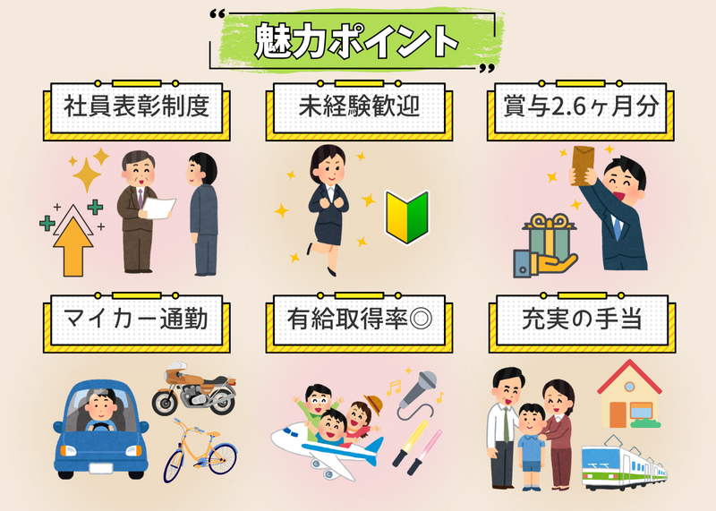 求めている人材 ◆必須条件 ・普通自動車運転免許(AT限定OK) ◆未経験スタート大歓迎! 高卒・第二新卒・社会人デビューも大歓迎! 実際に、未経験から入社した先輩たちもたくさん活躍中です! ≪こんな方にぴったり!≫ ・誰かの「困ってる」を助けるのが好き ・考えること・アイデアを出すのが楽しい ・チームで協力して進める仕事がしたい ・“伝える”ことに興味がある ・地元を盛り上げたい! \未経験入社3年目の先輩から一言!/ 【お気軽にご応募ください!】 あなたにお会いできる日を楽しみにしています♪ 年齢の条件と理由:あり(例外事由3号のイ・45歳未満(長期勤続によるキャリア形成のため))