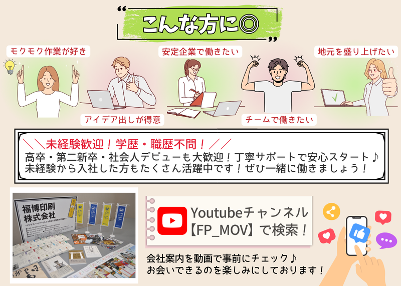 選考プロセス ありがたいことにお仕事の依頼が増えてきています!ポスターやチラシだけじゃなく、WebやSNSなど、時代に合わせたご相談も増えていて、もっとたくさんのお客様をサポートしていくために、新しい仲間を迎えたいと考えています! 未経験からでも挑戦できる環境を整えていますので、安心して飛び込んできてください! 【入社までの流れ】 応募→書類選考→一次面接→最終面接→内定 ※一次面接では職場見学を兼ねた面談を行います
