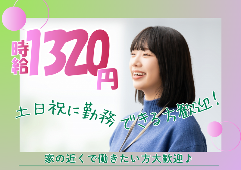 勤務時間詳細 9:00~17:00(休憩60分) ⭐土日祝のみ ⭐週1日~OK ⭐1日4時間~OK ⭐希望休相談OK