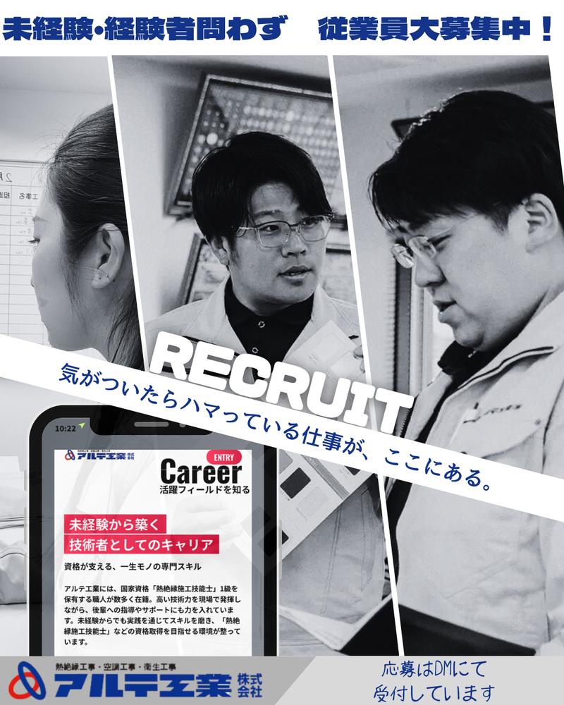 アピールポイント: 【試用期間中】まずは時給制からスタート ⇒業務に慣れていただく期間です。試用期間中も先輩がマンツーマンで指導します 【月残業10時間未満】18時退社が当たり前の職場 ⇒プライベートと仕事をしっかり両立できます 【全国展開リゾートホテルに年2泊・無料】 ⇒ご家族や友人と素敵な時間を過ごせます(会社負担) 【無料駐車場完備】 ⇒マイカー通勤OK。雨の日も安心 【昨年度 最大+12,000円の昇給実績】 ⇒頑張りがしっかり給与に反映されます 【創業23年・安定経営】 ⇒全国サブコンと継続契約。仕事が安定してあります 【資格取得を会社がサポート】 ⇒スキルアップしながら長く働けます