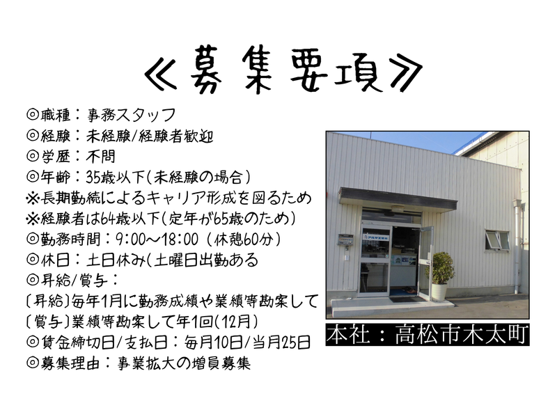 アクセス: JR 木太町駅(徒歩10分) ※マイカー通勤可(無料駐車場あり) ※自転車・バイクも可