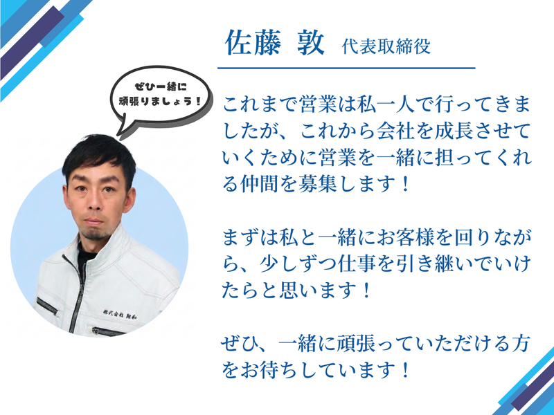 仕事内容 \\この求人のアピールポイント//  ̄ ̄V ̄ ̄ ̄ ̄ ̄ ̄ ̄ ̄ ̄ ̄ ̄ ̄ ̄ ̄ ̄ ̄ ̄ ✅3年目で年収900万円も可能 ✅社長直下ポジション ✅ノルマなし(成果は正当に還元) ✅高単価案件(300万〜2000万円) ✅フルフレックス(コアタイムなし) ✅将来の営業中核ポジション ⭐仕事内容⭐  ̄ ̄V ̄ ̄ ̄ ̄ ̄ ̄ ̄ ̄ ̄ ̄ ̄ ̄ ̄ ̄ ̄ ̄ ̄ \3年目で年収900万円も目指せる環境です/ 防水・建築工事の法人営業をお任せします。 施工管理会社・マンションオーナー・管理組合などの法人顧客が主な取引先です。 当社が大切にしているのは「誠実な営業」。 売上だけを追うのではなく、信頼関係を丁寧に築いていく営業スタイルです。 ⭐具体的なお仕事⭐  ̄ ̄V ̄ ̄ ̄ ̄ ̄ ̄ ̄ ̄ ̄ ̄ ̄ ̄ ̄ ̄ ̄ ̄ ̄ ⏩業務内容 ・既存顧客の引き継ぎ、定期訪問 ・新規顧客の開拓(電話・メール・訪問など方法は自由) ・アポイント取得、商談 ・見積提出、受注対応 ・工事内容の打ち合わせ ※営業ノルマはありません。 ※まずは社長に同行し、既存顧客との関係構築を学んでいただきます。 ※現場管理経験がある方は、現地確認なども歓迎(必須ではありません)。 ⏩新規・既存の割合 最初は既存9:新規1程度。 将来的には既存5:新規5へ拡大を目指します。 ⏩1日の流れ(例) 9:00 出社・メール確認 10:00 既存顧客訪問/打ち合わせ 13:00 新規開拓・アポイント取得 15:00 商談 17:00 見積作成・社内共有 18:00 退社 ※フルフレックス制度あり ※直行直帰可能 ※社用車貸与 ⭐想定年収⭐  ̄ ̄V ̄ ̄ ̄ ̄ ̄ ̄ ̄ ̄ ̄ ̄ ̄ ̄ ̄ ̄ ̄ ̄ ̄ 【1年目】 年収450万円〜550万円 (月給+賞与+インセンティブ年間受注1〜2件) 【2年目】 年収600万円〜750万円 (年間受注3〜4件想定) 【3年目】 年収800万円〜900万円以上可能 (年間受注5〜6件想定) ※案件単価300万〜2000万円 ※インセンティブ上限なし ※ノルマはありませんが、成果は正当に評価・還元します ⭐代表メッセージ⭐  ̄ ̄V ̄ ̄ ̄ ̄ ̄ ̄ ̄ ̄ ̄ ̄ ̄ ̄ ̄ ̄ ̄ ̄ ̄ これまで当社の営業は、代表である私自身が一人で担ってきました。 施工管理会社やマンションオーナー、管理組合の皆様と 信頼関係を築きながら、誠実な営業を積み重ねてきた会社です。 ありがたいことに案件は増えていますが、 今後さらに会社を成長させていくためには、 営業を本気で任せられる仲間が必要です。 特別な営業トークがあるわけではありません。 ただ、約束を守ること、丁寧な対応をすること、 誠実であることを何より大切にしてきました。 業界経験がない方でも、法人営業経験があれば、 見積もりの作り方から私が丁寧に教えていきたいと思っています。 単なる「売上を作る人」ではなく、 当社の営業の中核を担っていただける方をお迎えしたいと考えています。 ////////////////////////////////////// 《電話でのお問い合わせ希望の方》 090-1735-5989まで 「求人票を見た」とご連絡ください! ////////////////////////////////////// ⭐こんな方に向いています⭐  ̄ ̄V ̄ ̄ ̄ ̄ ̄ ̄ ̄ ̄ ̄ ̄ ̄ ̄ ̄ ̄ ̄ ̄ ̄ ✅建築業界で営業経験がある方 ✅法人営業経験3年以上の方 ✅裁量を持って営業したい方 ✅誠実な営業を大切にできる方 ✅成果に応じて収入を伸ばしたい方 ✅将来的に営業責任者ポジションを目指したい方 ⭐会社について⭐  ̄ ̄V ̄ ̄ ̄ ̄ ̄ ̄ ̄ ̄ ̄ ̄ ̄ ̄ ̄ ̄ ̄ ̄ ̄ 東京都江戸川区を拠点に、防水工事を専門とする施工会社です。 戸建住宅からマンション修繕、公共施設まで幅広い施工を手掛けています。 元請・下請の両方を行っており、安定した案件基盤があります。 ⭐キャリアアップについて⭐  ̄ ̄V ̄ ̄ ̄ ̄ ̄ ̄ ̄ ̄ ̄ ̄ ̄ ̄ ̄ ̄ ̄ ̄ ̄ まずは既存顧客の引き継ぎからスタート。 その後は単独で受注を担い、 将来的には営業の中心として活躍していただきます。 営業体制は将来2〜3名体制へ拡大予定。 営業の中核ポジションを担える環境です。 ⭐職場の雰囲気⭐  ̄ ̄V ̄ ̄ ̄ ̄ ̄ ̄ ̄ ̄ ̄ ̄ ̄ ̄ ̄ ̄ ̄ ̄ ̄ 現在、現場では20〜25歳前後の若手職人が中心となって活躍しています。 職人は未経験からスタートしたスタッフも多く、 チームワークを大切にしながら成長してきた会社です。 これまで営業は代表が一人で担ってきましたが、 案件増加に伴い営業体制を拡大予定。 職人の高い技術力をお客様に届ける役割として、 営業の中核を担っていただける方をお迎えしたいと考えています。 現場との距離も近く、チームで仕事を進める風通しの良い環境です。 ////////////////////////////////////// 《電話でのお問い合わせ希望の方》 090-1735-5989まで 「求人票を見た」とご連絡ください! //////////////////////////////////////