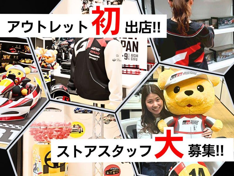 仕事内容 \\11月4日グランドオープン♪// 『TOYOTA GAZOO Racing Store』 ショップスタッフを大募集! 三井アウトレットパーク岡崎に、 トヨタのスポーツカーブランド <TOYOTA GAZOO Racing> アウトレット初出店の 常設アンテナショップがオープンします! 店内では、公式グッズの販売やモデルカーの展示を行います。 接客販売フロアスタッフとして、 ・お客様のご案内 ・公式グッズの販売・補充 ・レジや接客対応 ・展示やイベントのご案内 ・ラリー関連イベントでのサポート業務 などをお願いします。 モータースポーツファンは必見! 11月6日から愛知・岐阜で開催の ラリージャパン2025にも出場! 1・2・3、表彰台独占のTOYOTA GRチーム 話題のスポーツカーブランド『GR』 ここだけの限定コラボグッズも販売! スポーツカーファンの方には特にオススメ! TOYOTA GRシリーズの魅力を お客様に発信してください!