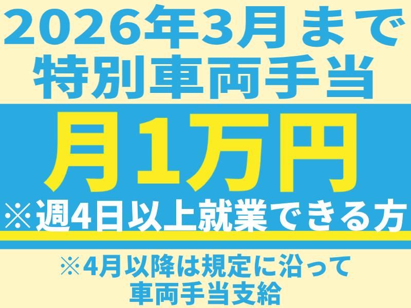 時給1,250円以上 給与詳細 基本給:時給 1250円 〜 ============= 【入社キャンペーン!】 2ヶ月間限定:時給1250円♪(※規定あり) ============= *仕事の都合上、早上がりになった場合でも1日分の給与は保証します! *週払い相談OK ==▼入社3ヶ月目以降▼== 【時給1040円~+手当】 <マイカー通勤している方> 令和8年1月~令和8年3月まで 【特別車両手当10,000円/月】支給 ※規定あり ※週4日以上就業できる方のみ ※4月以降は給与規定にのっとって車両手当を支給します ============= ■資格手当あり(所持資格により月5,000円~) ■精勤手当(月25日以上勤務で月2,000円) ■リーダー手当(月1,000円~5,000円) ■送迎手当(他のスタッフを送迎している人/月1,000円~3,000円) ※業務スキルにより昇給あり(規定あり) 【給与例】 給与例 <収入例> ★月収20万円 時給1250円×実働8h×月20日 ==▼3ヶ月目以降▼== *週2日勤務の場合 【月収6万6560円】 ※時給1040円×実働8h×8日(4週計算) *週3日勤務の場合 【月収9万9840円】 ※時給1040円×実働8h×12日(4週計算)