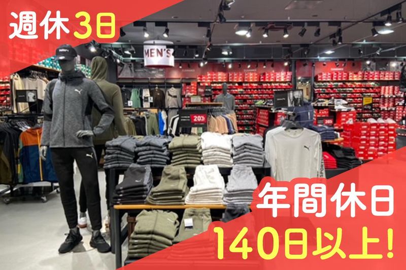 仕事内容 三井アウトレットパーク北陸小矢部内にある「PUMA OUTLET(プーマアウトレット)」で販売スタッフを募集中です! 〇ここがポイント!! ⭐週休3日! 連休取得も可能です アパレル販売スタッフには珍しい週3日休み、年間休日140日以上! プライベートを充実させたい人にオススメです ⭐接客販売未経験者OK 「アパレル業に憧れはあるけど、接客業の経験がない…」という方も必見!できることから始めましょう! 商品整理→レジ→販売補助と、できることを少しずつ広げていただければOK ⭐20〜40代の男女スタッフが活躍中 富山市内や、石川県から通っているスタッフも多数います! 交通費は上限30,000円まで支給 ⭐社員割引有 お得に好きなアイテムを購入できます♪ ご応募前にご質問等のご連絡もOK! まずはお気軽にお問合せください(0766-78-3240) <「PUMA OUTLET」とは> フットボール、ランニング & トレーニング、モータースポーツのカテゴリーで、パフォーマンスプロダクトとスポーツにインスパイアされたライフスタイルプロダクトを提供しています。 <具体的なお仕事> PUMAブランドのアパレルやシューズ、アクセサリーの接客販売、商品管理をお願いします。お客様への商品のご説明やレジでの販売対応、そのほか商品の整理や店内のディスプレイなど、店舗運営全般の業務をお願いします。 〇入社後の流れ ・まずは先輩スタッフとお仕事を行いながら、商品説明の仕方やレジ対応の流れを覚えてください。いきなり一人での接客をお任せすることはありませんから、ご安心ください! ・研修を通して、商品知識もしっかりと身に着けることができます。接客未経験でも先輩スタッフがフォローするので大丈夫! しっかりとサポートしますから、未経験の方も安心ですよ。 ・まずは笑顔で挨拶をすることからスタート! スポーツが好き、ファッションが好き、人と話すことが好きという気持ちがあればOKです。アパレルのお仕事に多いノルマはありません。楽しくお仕事できますよ! ご応募をお待ちしております! ・隣店の「PUMA SPORTS OUTLET」で勤務の場合もあり