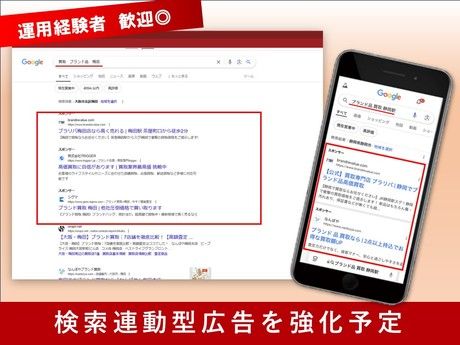 仕事内容 役員直下のマーケティングチーム/成長企業のデジタルマーケター \創業から15年連続売上増の成長企業/ 当社は、ブランド品買取専門店「まねきや」を全国に12店舗展開しています。 他にも、アパレルオークション「マネオク」、シャネル専門の販売店「CO&CO」など事業拡大中。 来期の売上目標は100億円と急拡大を行う当社の、デジタルマーケティング全般をお任せします! 【お任せしたい役割と業務内容】 デジタルマーケティング全般をお任せします。 役員直下のポジションですので、マンツーマンでコミュニケーションをとりながら 集客戦略を考え実行していきます。 評価によっては、将来的に役員としてより大きな裁量を持ち、経営参画していただきたいと思っています! ・デジタルマーケティングの予算管理 ・広告代理店とのWeb広告運用ディレクション ・リスティング広告、SNS広告/インフィード広告、アドネットワークの運用管理 ・LINEアカウントのコンテンツ企画、制作進行管理 ・アクセス解析を基にした課題抽出、改善策の立案、実行、効果測定 ・各種マーケティング施策におけるKPI、KGI設定 ・SEO/コンテンツマーケティングのディレクション ・LP等含む広告クリエイティブ制作ディレクション ・Adobe Analytic、Google Analyticを使った分析 ・レポーティング作業等 【検索連動型広告に精通している方大歓迎!】 直近では、検索連動型広告を強化していきます。 運用経験がある/精通されているという方は大歓迎です。 成長企業だからこそチャレンジが可能! 有名タレントの起用やテレビCMの放映など、独自のブランド戦略で急拡大中。 新規顧客の獲得、事業拡大に向けて更なる「投資」を行い、WEB領域を強化していきます。 予算が使えずやりたいことができないといった経験はありませんか? 投資フェーズだからこそ、よりダイナミックな戦略実行が可能です! 「売る」は「めぐる」。価値あるリユースで、経済の循環を。 リユースは、物が持つストーリーを継承し、世の中を循環させてくものだと考えています。 価値ある物がより多くの人に届くよう、我々はリユースのある日常づくりを目指しています。 そして、リユースによる日本の経済の循環と、みなさまの生活に豊かさを提供できることを願っています。