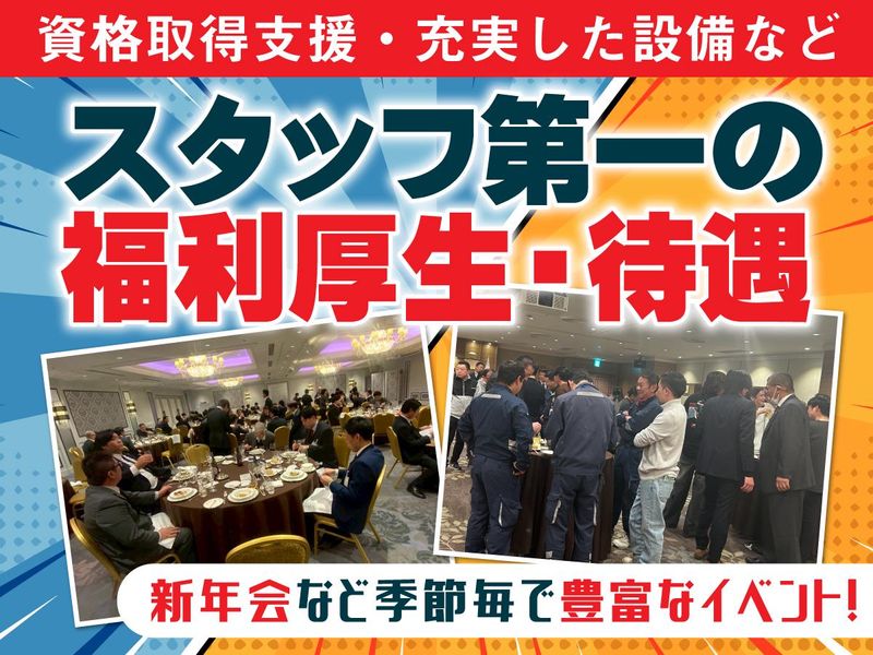 職場環境 今年の新年会はホテルで立食パーティを開催したりなど、イベントも盛りだくさん◎ 日々の頑張りを労う催し物や充実した福利厚生があるからこそ、「ここで長く働きたい」と思ってくれる社員は多いです。 仕事のオンオフを大切にしながら、会社の成長に貢献していきましょう! 喫煙所:なし(敷地内全て禁煙)