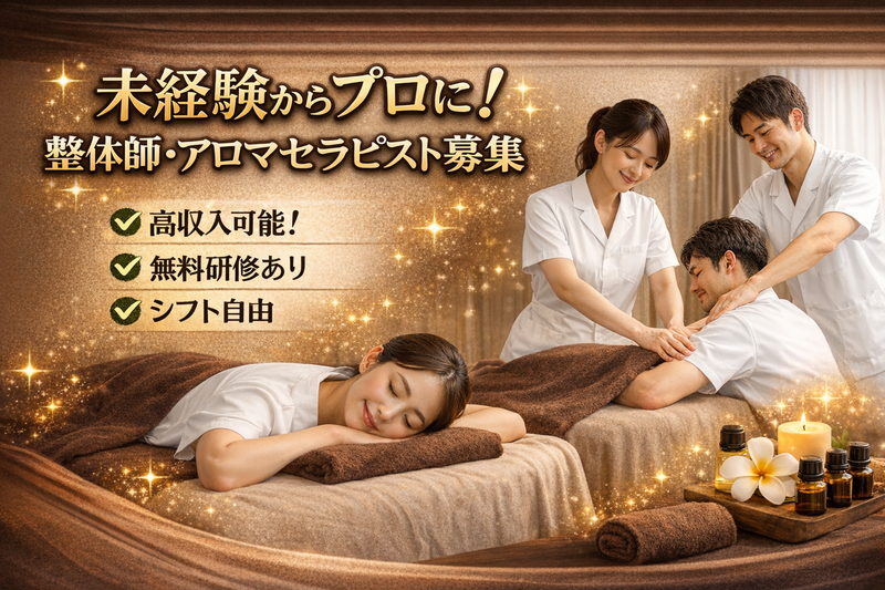 アピールポイント: 未経験者でも安心のプログラム 9割のスタッフさんが未経験からのスタートです。スクール併設している当社だから出来るきめ細やかなカリキュラムと国家資格持ちや一流セラピストによる完全マンツーマン指導でしっかり指導させていただきます 未経験者や他業種からの転職者もたくさん活躍している当社で手に職つけて一生の仕事を始めてみませんか? 講師達は直営サロン元トップセラピストや柔道整復師など国家資格者などの特別な講師達があなたをサポート * 営業ノルマ一切なし、残業なし * 技術研修あり(無料) * 即勤務OK(経験者のみ) * シフト自由 * フリーター活躍中 * 経験者優遇 * ブランクありOK(希望により研修に参加) * 1日4時間〜OK * 週2回〜OK * 正社員さんやパートさんの副業OK * 高収入 * 未経験◎