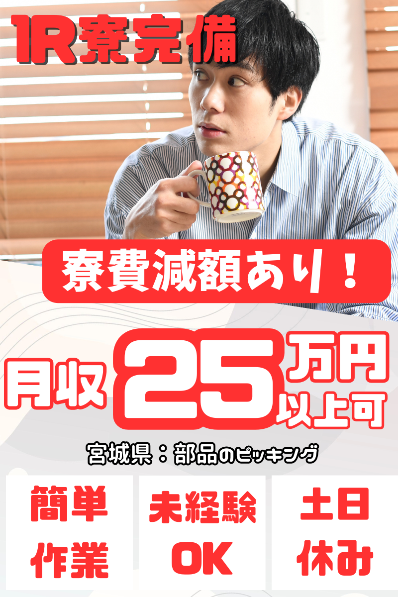 仕事内容 ●寮・社宅完備 ●20・30代活躍中、男性活躍中 ●未経験・初心者活躍中 ●高収入、月給25万円以上 ●土日休み、正社員登用あり 【 仕事内容 】 自動車の「フロントグリル」 「ラジエーターグリル」と呼ばれる 顔の部分を作る工場! <部品ピッキング> ゴーグルを装着し、部品のピッキング。 レンズ部分に必要な部品が表示されるので VR眼鏡のような感覚でピッキングができます。 必要個数や、取り出したい部品がすぐに分かります。 部品は500グラム~5キロ程度。 台車を使った運搬作業などもありますが、 コンピューター制御で管理されているので 負担が少なく作業できます。 一部中腰の動きをしたり、 部品を抱える動作があります。 <部品の組付け補助> 組付け専用の機械の補助作業。 部品をカゴから取り出し、機械にセット。 完成後はそのまま次の工程へ流します。 <検査> 空港の手荷物検査のようなイメージの検査。 カメラが部品をスキャンするので、 画面でエラーが無いか確認。 次の検査工程はヒトが目視で行います。 傷や歪みのチェックをして、 合格したものを次の工程に渡します。 <塗装マシンオペレーター> 車のインパネなどの塗装をします。 塗装は機械が行うので、 50センチほどの部品を塗装台に乗せるのがメインです。 《 ここがポイント! 》 綺麗なカフェのような食堂あり! おしゃれな食堂完備! 休憩時間もしっかり確保されているので 綺麗な食堂で推しの動画を観たり ゲームをしたりみなさんリラックスしています。 《 社員ファーストの環境! 》 重量物運搬時には コンピューター制御を使用して アシストします。 また、ピッキング工程では 何度も同じ場所を 往復しなくて良いように 効率よいルートを案内してくれたりと スタッフが働きやすい環境を会社が整えてくれています。 《 先輩インタビュー 》 スタッフKさん(男性:29歳)1ヶ月前入社 入社してすぐですが、 効率よく動けるようにシステム化された 工場のためとても快適に働けています。 空調もしっかり利いていていて 暑い・キツイという今までの工場のイメージはた全然違います。 マニュアルも確立されているので 入社して1週間くらいでもう慣れました(笑)
