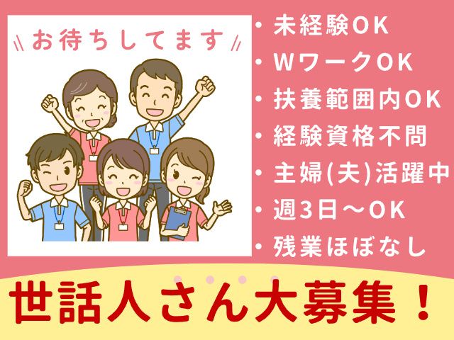 仕事内容 夜勤の生活サポートの世話人 アルバイト・パート募集! 週2日~勤務OK!未経験OK! 無資格・未経験の方でも働けます。 「世話人のお仕事」 軽度の障害のある方の補助や 支援のサポート業務です。 普段の家事の延長で出来る 簡単なお仕事なので、 年齢・経験関係なく挑戦できます! 主なお仕事は ・夕食の片付け、朝食の準備 ・施設内共用部の掃除 ・薬の飲み忘れチェック などの業務をお願いします。 入浴などの介助はございません! 利用者様の日常生活のサポートなので、 生活をしながら働ける感覚です。 残業はほとんどありません。 主婦(夫)の方から定年退職後に 働いているシニアの方など、 幅広い年齢層が活躍中です! <朝食について> 食事メニューは事前に管理栄養士の方が 作成したものを作っていただきます! かんたんな家庭料理なので、難しいことはありません! 朝食 例)焼き魚・目玉焼き・サラダ・味噌汁など 食材準備も事前用意されたものなのでご安心下さい。 利用者様の日常生活のサポートなので、 生活をしながら働ける感覚です。 残業はほとんどありません。 主婦(夫)の方から定年退職後に 働いているシニアの方など、 幅広い年齢層が活躍中です! 「勤務地について」 泉区にあるグループホーム ・フィオーレ歩坂 での勤務になります。 マイカー・自転車通勤可能なので 通勤ラクラクです! ※交通費も規定内支給いたします。 「週2日~勤務OK」 勤務日を選べるので、 子育ての合間や空いている日を利用するなど ご都合に合わせて働く事ができますよ。 Wワークも可能です! 「おすすめポイント!」 ・未経験OK ・経験、資格、性別、年齢不問 ・主婦(夫)パート活躍中 ・中高年活躍中(ミドル・シニア) ・WワークOK ・扶養範囲内OK ・服装自由 ・週2日~OK ・残業ほとんどなし ・資格取得支援制度有 「こんな方お待ちしております」 ・アルバイト・パートのお仕事をお探しの方 ・福祉に興味がある方 ・定年退職後の方 ・中高年の方(ミドル・シニア) ・仕事復帰したい方 (主婦(夫)の方・子育て中の方) ・Wワーク希望の方 など 「世話人の魅力」 利用者様は異なる障がいを抱えており、 支援の方法は様々ございます。 世話人として、一人ひとりの個性に 寄り添いあいながら、 利用者様に合った対応をしていきます。 徐々に利用者様との関係を築いていく中で、 少しずつ表情が変わったり、相談ごと、 困ったことを打ち明けてくれて 信頼関係が出来上がってきたと 実感できることが魅力です。 経験・年齢・資格は問いません。 世話人は未経験でも始められます。 子育て経験なども活かせます。 久しぶりに働きたいと思っている 主婦(夫)の方や子育てが一段落した方、 中高年・ミドルの方、 定年退職したけれどまだまだ元気に 働きたい60代以上の方もお待ちしております。 「活かせる経験」 ・介護福祉士 ・サービス管理責任者研修 ・介護職員初任者研修(旧ヘルパー2級)など 【グループホームってどんなところ?】 グループホームとは、精神障害や知的障害をお持ちの障害者がお食事をしたり声掛けなどの支援を受けながら生活を送る住宅型福祉施設になります 一般的なアパートに共有部屋を作り、それぞれの部屋には入居者様が生活をしています。イメージとしては普通のアパートと同じです! 無資格・未経験の方でもできる業務です。 経験者は即戦力としてすぐに働けます! 【入社日は相談に応じます!】 年明けからの勤務もOKです! お気軽にご相談下さい! 特別な資格も必要ないので、 障害者グループホームのお仕事に興味がある方、 まずはパート・アルバイトから福祉のお仕事に 携わりたい方、ぜひご応募ください。