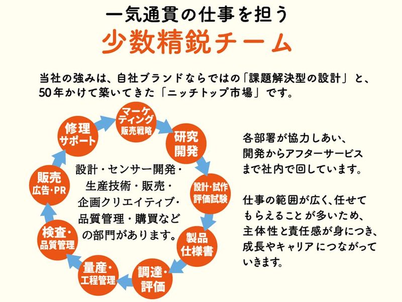 仕事内容 ◤ ◥ ✨✨AI導入で社内DXを推進する 専属エンジニア(社内SE)✨✨ 新規立ち上げポジションです ◣ ◢ 当社は「酸素濃度計」を自社開発する 創業55年のメーカーです。 酸素濃度計の業界では日本トップシェア。 独自のセンサー技術や、ニッチトップ戦略で 毎年売上を伸ばしている高収益メーカーです。 そんな安定した業界で、 仲間とともに切磋琢磨しながら、 社内SEとして、あなたの経験や実力を発揮しませんか? ⭐主な仕事⭐ AIを活用して、社内各部門の仕事を 自動化する仕事です。 既存の基幹システムやデータベースと、 各種AIとの連動を図るシステムを開発し、 現場の自動化/省人化を推進していきます。 ⭐具体的な仕事例⭐ ▶営業スタッフと連携して… 顧客からの問い合わせ情報(音声・テキスト) を社内の各種ナレッジと連動させ、 心のこもったメールを自動生成。 顧客の購入履歴や活動履歴の データベースを用いて、 継続的にサポートやマーケティングできる よう基幹システムの改善、AI連動化。 ▶調達スタッフと連携して… 既存の基幹システムの改善し、 部品の最適発注時期や最適在庫管理、 原価などの管理体制の自動化。 ▶生産スタッフとの連携して… AIを用いた外観検査、 品質検査の自動化 など ⭐ポジションの魅力⭐ ▶社内SEの主担当 ▶社長直下で、スピーディな意思決定 ▶現場ですぐに運用化。裁量と手応え感◎ 入社後は、経験豊富な現場スタッフと ともに、明確な課題設定のもと、 あなた自身が主担当として仕事を推進します。 当社では、会社一丸となって 「チームワーク」「協調性」「利他の精神」を 大切にしていますので、丸投げはしません。 安心して、全力投球していただけます。 ⭐初期配属⭐ 入社時は、まずは営業部の配属となり、 現場の社員とともに実務を把握しながら システム開発をしていただきます。 専属のお世話係が、計測器の知識や 課題設定や仮説立てなどを しっかりとサポートしますので、 安心して、システム開発に注力できる環境です。 ⭐達成スケジュール⭐ 3ヶ月単位を目安に、システム構築をしていきます。 できたシステムはすぐに現場で運用していきます。 ⭐安心の教育体制、キャリア構築⭐ システム開発に必要な業界知識などを 勉強会を通して指導していきます。 各部門と連携して仕事を進めていくため、 SEとしての実績だけでなく、 自社製品の開発プロセスや マネジメントスキルも身に付きます。 ⭐当社のアピールポイント⭐ 酸素濃度計の開発で業界をリードし、 製品、アフターサービスも高く評価され、 日本全国のお客様企業から厚い信頼を いただいています。 業界初の5年間保証や、修理期間中の代替機 無料貸出しなど、常にお客様の視点に立ち、 真に必要とされるサービスを追求してきました。 その結果、業界トップクラスのリピート率を 誇り、高い顧客満足度を維持しています。 私たちは、自社の強みに一層磨きをかけて お客様に必要とされる製品とサービスを 提供し続けることはもちろん、 価格決定権のある製品とサービスを 創り上げることで会社の収益力を高め、 物価上昇に負けない年収を社員に 提供することを目指している会社です。