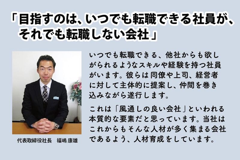 選考プロセス 1)WEBよりご応募 2~3日以内に、電話orメールにて 連絡します。 ↓ 2)会社見学・面談 当社の事業や仕事内容、職場環境、 社員の雰囲気など見ていただき マッチングをご判断ください。 面談時はご自身の実績をご提示ください。 ↓ 3)適性検査(オンライン) ご自宅にて受検いただけます。 ↓ 4)面接 書面での履歴書、職務経歴書を ご持参・提出ください。 入社時期は、ご希望に沿います。 ↓ 5)採用内定