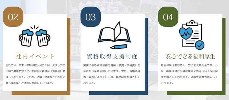 求めている人材 ✨「仕事も生活も諦めたくない」 そんなあなたを歓迎します! 【必須条件】 ◎1級・2級建築施工管理技士 もしくは土木施工管理技士の 資格保有者、または3年以上の実務経験者 (前職の業界や経験年数は不問) ◎普通自動車免許(AT限定可) 【こんな方も活躍できます】 ◎残業や休日出勤の多さに 疲れてしまった方 ◎U・Iターンで地元に貢献したい方 ◎ブランクがあるが、資格を 活かしたい方 ◎家族との時間を大切にしたい方 ◎経験を正当に評価し、安定した 基盤で働きたい方