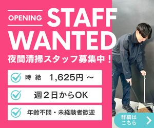 仕事内容 ◇ = = この求人のポイント = = ◇ \\ オープニングスタッフ!! // ◇高時給1625円!5時間で効率よく稼げる ◇週2日〜&無理のない範囲で勤務OK! ◇未経験歓迎/20代〜60代活躍中 ◇新設のキレイなホールでお掃除 ◇基本接客なし&深夜のモクモク作業中心 ◇ユニフォームの支給あり♪ ◇髪色自由!ネイル・ピアスOK◎ = = = = = = = = = = 渋谷に誕生したばかりの新しい施設 「Shibuya LOVEZ」で 深夜の清掃スタッフさんを募集します! お願いしたいのは、きれいな施設を 気持ちよく使っていただける状態に 保つこと。深夜帯は接客が一切なく、 静かな環境の中自分のペースでコツコツ 作業に集中できます。 「適度に体を動かしながら働きたい」 「高時給で効率よく収入を増やしたい」 そんな方にピッタリのお仕事です。 = = = = = = = = = = 【仕事内容】 ・施設内の床面掃き拭き ・掃除機掛け ・ゴミ回収 ・水回り清掃など 【お仕事の流れ】 ☆1日のスケジュール 23:00 現地に到着し打刻、ミーティング └その日の担当場所を確認します ↓ 23:10 清掃作業開始! └最新施設のロビーや 通路・水回りなどのお掃除 ↓ 04:45 片付け、終礼 ↓ 05:00 打刻して退勤 「お疲れ様でした!」 難しい作業は一切ありません。 コツコツ・モクモクと自分のペースで 作業ができますよ! 慣れるまではしっかりフォローするので 未経験の方も安心してご応募ください♪ = = = = = = = = = = 【ここがポイント!】 ★安心の通勤ルート 賑やかなセンター街を通らずに通勤できる 安全なルートをご案内しています。 ★適度な運動に! 立ち仕事が中心なので、 日々のウォーキング代わりや 運動不足解消に最適です。 ★豪華な福利厚生 スパ ラクーアやホテルの割引制度あり! 仕事終わりに安くリフレッシュも可能です。 ユニフォームの支給もあるのでスムーズに スタートできるのも魅力♪ ____________________ ■「Shibuya LOVEZ」について 【HP】https://shibuyalovez.jp/ 【プロモーションムービー】 https://www.youtube.com/watch?v=vt_iEHvel-Q