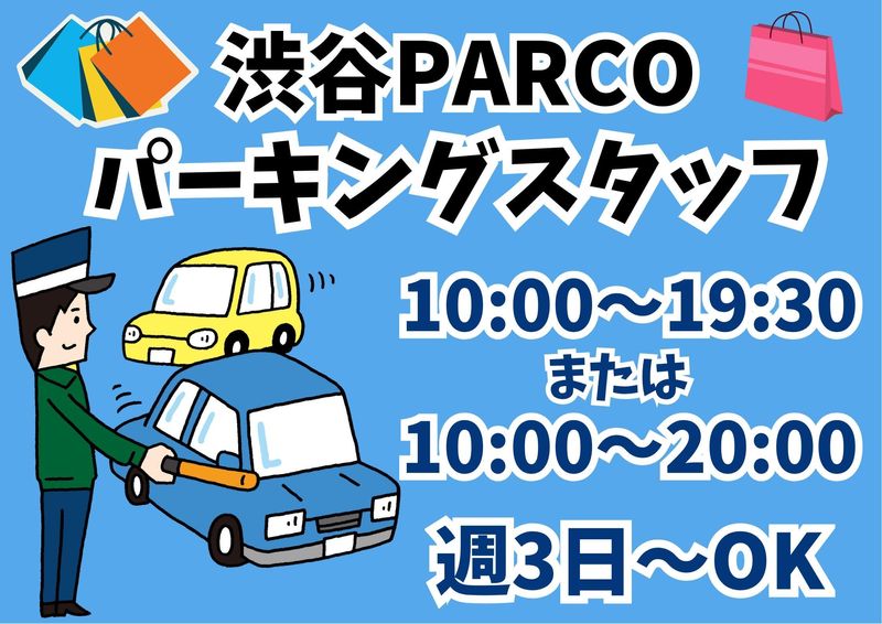 仕事内容 【渋谷PARCO】人気商業施設で働く!パーキングスタッフ \未経験・ブランク大歓迎!長期勤務で安定収入!/ 中高年・シニアスタッフ活躍中! 【お仕事内容詳細】 駐車場入口と荷捌場での車両誘導をお願いします! ・入退場する車の確認&誘導 ・空いている駐車スペースのご案内 ・歩行者の安全確保やご案内 事前研修もアリ! DVDを上映したり、ボードに書いて説明したり、 スムーズに理解していただけるよう工夫を凝らしています! 駐車場スタッフやアルバイト未経験の方、大歓迎! *詳細は面談の時にお伝えします。 【オススメポイント】 ◆未経験でも安心のシンプル業務! 駐車場内や入口で車や歩行者を誘導するだけの簡単なお仕事! 「こちらへどうぞ」「進んでください」などの案内がメインなので、特別なスキルは不要! ◆週3日~OK! 無理なく続けられるよう、勤務日数・曜日はお気軽にご相談ください ◆交通費全額支給&直行直帰OK! どんなに遠くても安心な【交通費全額支給】! <<WEBでも対面でも面接対応可!>> 〇日払いOK *日給から7000円現金先払い 〇88勤務達成後、ボーナス5万円支給!