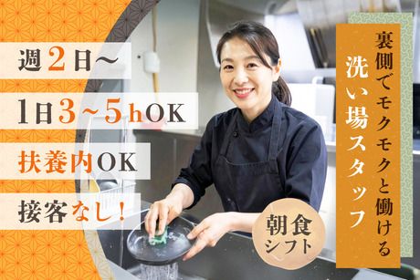 仕事内容 【おすすめポイントが盛りだくさん】 ◆お客様対応なし◎人気の裏方ワーク ◆週2日~・1日3h~OK ◆短時間シフトでサクッと働ける ◆扶養内で働きたい方も大歓迎です 【コツコツ取り組める洗い場のお仕事】 8月にリニューアルオープンした キレイなホテルレストラン内の 洗い場スタッフを募集します! < お任せするのは > □:食器・調理器具の洗浄(食器洗浄機使用) □:洗い終わった食器の片付け □:料理の運搬(業務用エレベーター使用)など 未経験の方でもすぐに覚えられる “洗い物中心”のお仕事です♪ その他、洗い物が落ち着いた時間帯に、 簡単な片付けや清掃をお願いします。 【働きやすい柔軟シフトが魅力】 【朝食シフト】7:00~11:00 ⇒上記時間の中で3~4hだけ!! 週2日~土日だけの勤務もOK! ライフスタイルに合わせて働きやすい♪ ▼ 夕食の時間帯も同時募集中 ▼ 夜は17:00~23:00内で実働3~5h! 中抜け休憩もOKなので、朝・夜のシフトを 組み合わせたフルタイム勤務も可能です◎ 【未経験・ブランクのある方もOK】 一つひとつの作業を丁寧にこなせる方、 仲間と協力しながら仕事を進められる方なら 世代や性別を問わずご活躍いただけます! お友達とご一緒の応募も大歓迎です♪ 入社後はオリエンテーションを実施◎ 先輩スタッフがしっかり フォローするのでご安心ください。