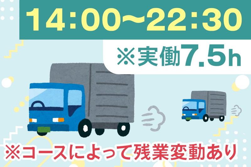勤務時間詳細 実働時間:1日あたり7時間30分 平均勤務日数:1ヶ月あたり22日 〜 25日 ⏰14:00~22:30 ※実働7.5h、休憩1h ※1日3h程度の残業があります <1日の流れ(例)> 14:00 出勤、点呼・伝票準備 15:00 出発、配送(4~5件) 18:00 休憩(1h) 19:30 積み込み作業 20:30 出発、配送(4~5件) ※コースによって残業変動 22:30 退勤 ゆっくり出勤できるので、 余裕のあるライフスタイルが実現!
