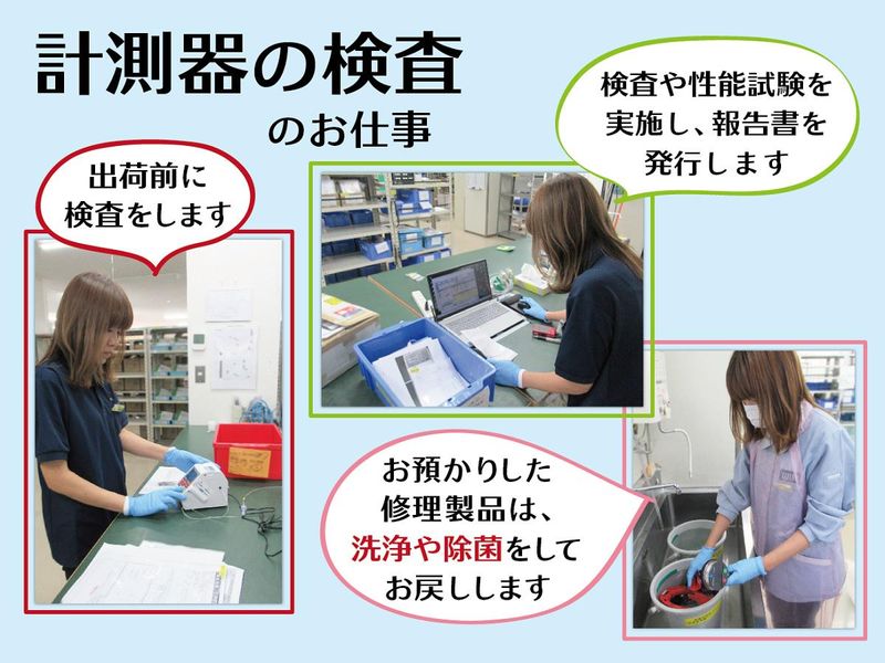 仕事内容 ◤ ◥ ✨未経験から始められる✨ 計測器の検査のお仕事 将来に向けてスキルアップも可能! ◣ ◢ \\ この求人のアピールポイント // ✅土日休み&長期休暇あり! ✅有給休暇100%消化を奨励! ✅充実したマニュアルと 丁寧な指導で安心スタート◎ ✅ワークライフバランスを 大切にできる職場環境! ▼ 具体的な仕事内容詳細 ▼ =================== ・新品製品を出荷する前の検査 (マニュアルに従った定型作業) ・性能確認のための試験と結果の記録 (簡単なPC入力作業) ・修理依頼で送られてきた製品の開梱、 洗浄や除菌、修理部品の準備や引き渡し ・修理完了後チェックと書類発行 (簡単なPC入力作業) ・検査や修理に付随する補助作業 ★製品は卓上サイズのため、軽作業です。 ★立ち仕事と事務の割合は8:2ほどです。 ★ゴム手袋を装着する作業があります。 =================== ◆手順書やチェックリストにそって実施する 繰り返しの定型作業が多いです。未経験 でも先輩社員が丁寧に教えますので、 安心して挑戦していただけます。 ◆パソコンを使った検査証明書の発行など 事務作業もあります。 ◆所属は検査課ですが、社内の営業部や 製造部スタッフとの連携も大切なので 人とのコミュニケーションが好きという 方にピッタリのお仕事です。 ▼ 働きやすい職場環境 ▼ =================== ◆当社では、有給休暇の取得を推奨! 土日休みや年3回の長期休暇も 完備しています。 家事や育児などプライベートと仕事の バランスを大切にしたい方にとっても 理想的な職場環境です◎ ▼ 安定業界だから安心 ▼ =================== ◆精密機器の製造を手掛け、 酸素濃度計メーカーとして 毎年売上を伸ばしている当社。 当社独自の技術を用いていることから、 食品・飲料・製薬メーカーなど 日本全国の企業様より 長い間、ご指名をいただいております。 ◆安定して長く働いていける当社で 一緒に高品質な製品を作る仲間として 活躍してみませんか? 単純なライン作業ではないので 「難しいな」と思うかもしれませんが、 慣れた頃には貴重なスキルとして 自信につながっていきます。 ご応募をお待ちしております!