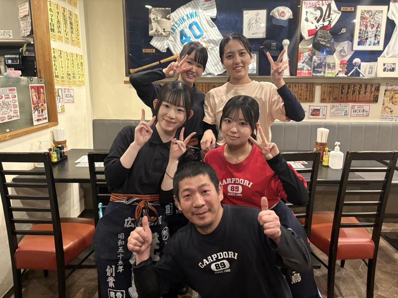 仕事内容 お店はカープ鳥という名前の通り、 メニューの1つ1つが カープの選手の名前になっているのが特徴! 例えば、、、 ✅新井監督⇒心臓(ハツ) ✅秋山翔吾⇒三枚肉しそ巻き ✅オオノ⇒ナス などなど… 野球を知らない人も 野球を知ってる人も「?」になるのですが、 当店はそんなアナタのために!! ハンディでオーダーが できるようにしておりますので、 メニューは追々覚えていけばOKです♪笑 ✨ホール *オーダー取り *商品・ドリンクの提供 *バッシング(お皿下げ) ✨調理補助 *簡単な盛付や野菜カットから! *簡単な盛付 *野菜カット *慣れてきたら焼き等も! ※お仕事は適性に応じて、配属致します ✨店長からメッセージ✨  ̄ ̄ ̄ ̄ ̄ ̄ ̄ ̄ ̄ ̄ ̄ ̄ 飲食未経験から、 スタートした先輩ばかりなので、 あなたの気持ちを理解してくれます! 私自身も実はバイトから、 スタートしています♪ ✨スタッフさんからメッセージ✨  ̄ ̄ ̄ ̄ ̄ ̄ ̄ ̄ ̄ ̄ ̄ ̄ ̄ ̄ ̄ ̄ 最初は野球やカープの事は 全く分からなかったけど、 楽しく勤務しています! 現在、大学生と フリーターさんが在籍中です! 大学生3名はWワークで頑張っています★ バイトデビューの方も問題ありません! 不明点は我々先輩スタッフが しっかりと教えるので、 分からない事は聞いて下さいね。 研修中も一人ぼっちにはさせません! 丁寧にサポートします! まずはお店の雰囲気に慣れていきましょう♪
