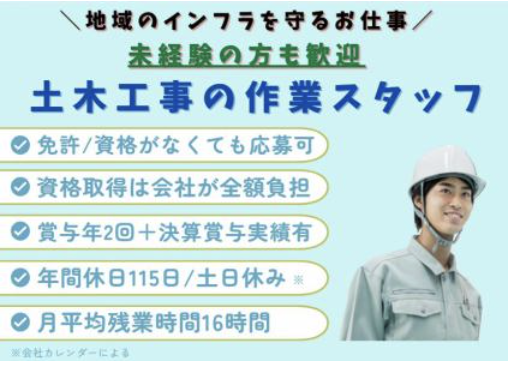 仕事内容 ⧉◆この仕事の魅力◆⧉  ̄ ̄ ̄ ̄ ̄ ̄ ̄ ̄ ̄ ̄ ̄ ̄ ̄ ̄ ̄ ̄ ̄ ̄ ̄ ̄ モノづくりの醍醐味を感じられる仕事です。 自分たちの手がけた工事が形になり、 地域のインフラ整備に貢献できることが やりがいにつながります。 チームで協力しながら作業を進めるため、 仲間との連携や達成感を 共有できる環境があります。 ⧉◆具体的な仕事内容◆⧉  ̄ ̄ ̄ ̄ ̄ ̄ ̄ ̄ ̄ ̄ ̄ ̄ ̄ ̄ ̄ ̄ ̄ ̄ ̄ ̄ 土木工事全般の作業・業務を 担当していただきます。 ⏩型枠工事 ⏩生コン工事 ⏩構造物据付工事 ⏩1工事あたり2~4人のチームで 作業を行います 未経験の方には、先輩スタッフが丁寧に 指導しますので安心して始められます。 ※業務でマニュアル車の運転が必須のため 普通自動車免許がAT限定の方はご相談く ださい。 \\⧉◆この求人のポイント◆⧉//  ̄ ̄ ̄ ̄ ̄ ̄ ̄ ̄ ̄ ̄ ̄ ̄ ̄ ̄ ̄ ̄ ̄ ̄ ̄ ̄ ✅未経験OK!丁寧に指導します♪ ✅土日休みの完全週休2日制! ✅年間休日115日 ✅昇給あり・賞与年2回 ✅+決算賞与の実績も◎ └ここ3~4年は毎年出ています ✅男性社員の育休取得実績もあり ✅平均年齢は44歳以下 ✅残業月平均16時間とほぼ無し ✅退職金制度あり◎ ✅資格取得は会社が全額負担 ✅福利厚生充実!社内旅行や親睦会など 活気ある職場です✨ ⧉◆会社について◆⧉  ̄ ̄ ̄ ̄ ̄ ̄ ̄ ̄ ̄ ̄ ̄ ̄ ̄ ̄ ̄ ̄ ̄ ̄ ̄ ̄ ✅創業以来、48年の歴史を積み重ねて きた土木工事を専門とする会社です。 ✅建設機械専門重機オペレーターの会社で、 大型ダンプ業、一般土木業など、 幅広い分野で工事を手がけています。 ✅小規模な工事から大規模工事まで、 様々な現場で活躍できる環境があります。 ✅下請の仕事が8~9割 ✅今後は施工管理や営業を担う人材を 積極的に強化して、総合建設業の レベルにまで会社の規模を発展させる ことを目標としています。 未経験からでも、チームで協力しながら 技術を身につけていける環境です。 公共工事などの現場を通じて、 地図に残る仕事に挑戦してみませんか✨ ※ハローワークにも掲載中!