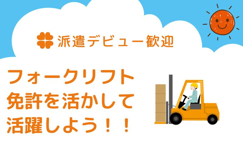 求めている人材 【必須】 ◆要フォークリフト免許 (経験は半年程度あればOK!) ◆カウンターリフト経験あれば尚可 ◆30代~50代の男女スタッフ活躍中 ◆今までは正社員やバイトだったけど 派遣で働いてみたい!という方も 大歓迎です◎ ◆ブランクOK ◆Uターン・Iターン歓迎 ◆学歴不問 ◆経験者歓迎
