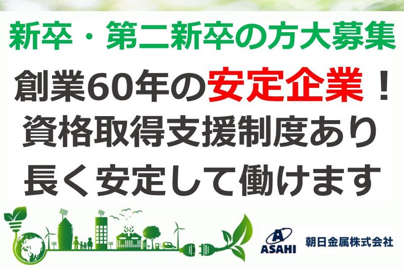 【アピールポイント】 【お電話でのご連絡はこちら】 朝日金属株式会社 本社工場 TEL:052-901-2111 受付時間:朝8時~18時の間にお願いします。 ■新卒・第二新卒の方にもオススメ ■創業60年を超える安定企業だから将来も安心! ■リサイクルに関わる資格・技術を習得しスキルアップできる!