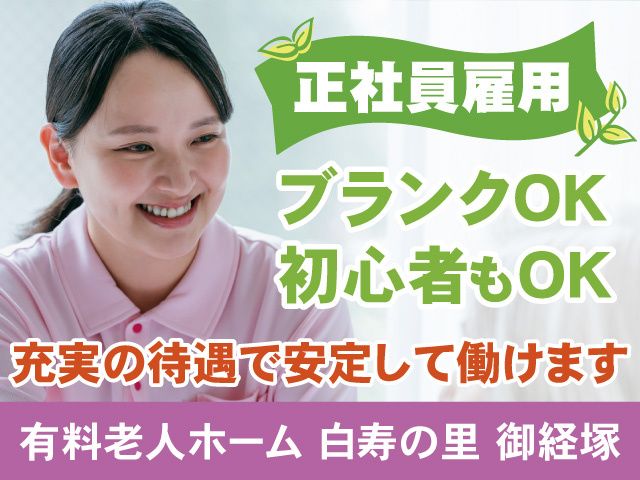 仕事内容 住宅型有料老人ホーム「白寿の里 御経塚」にて 正社員の介護スタッフ募集中! ////////////////////////////////////////////// ▼ 未経験・ブランクOK! 資格はあるけど実務経験がない方、 介護職にブランクがある方も大歓迎 ▼ 安定の正社員雇用! 昇給・賞与・資格手当など、 安心して長く働ける待遇が充実◎ ▼ 週休2日制! ワークライフバランスを大切にできます ////////////////////////////////////////////// 【お仕事内容】 施設入居者様への介護業務をお願いします。 ワンフロア8~12名のご利用者様に対し 日常生活の支援(食事・入浴・排せつ介助など)や見守り、 レクリエーションなど行います。 \ゆとりある人員体制で安心/ ご利用者様32名に対し、スタッフは約25名。 一人ひとりにしっかりと寄り添える、無理のない職場環境です。 職員同士も助け合いながら働いており、 未経験の方やブランクのある方も安心して働けます。 〈安心の医療・介護体制〉 訪問診療・訪問看護・訪問リハビリと連携し、 介護スタッフが安心して働ける体制が整っています。 また、清掃や洗濯などは外部提携先が担当するため、 介護業務に集中できる環境です。 「まずは話だけ聞きたい」という方も歓迎です。 あなたからのご応募を心よりお待ちしています。 【施設見学、随時受付中!】 まずは実際の雰囲気を見てみたい方も大歓迎! お気軽にお問い合わせください。