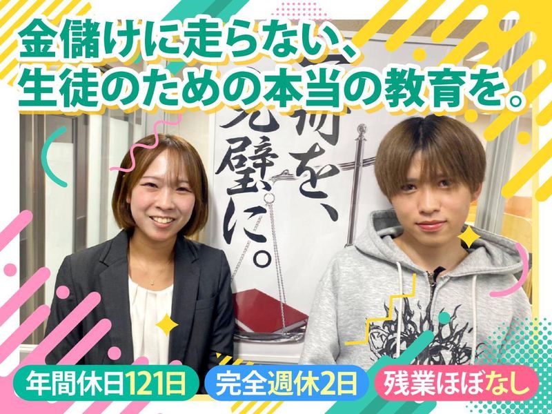 仕事内容 ■ 年間休日121日★完全週休2日 ■ ほぼ定時出勤・定時退社しています ■ 有給もしっかりとれる体制 ■ 常識や型にハマらない教育を! - ―「教育がただの金儲けになってはいけない」 もちろんボランティアでもないけど、 ただ利益だけを追求するものじゃない というのが、私たちの考え。 売上のために不必要な授業や講座を とらせるなんてもってのほか。 生徒が行きたい学校に受かるために。 生徒が決めた目標を達成するために。 私たちの軸はいつだって、 生徒の今と未来を想う気持ちにある。 / だからこそ、 こんな人と働きたい! \ 今回採用したいのは、学習塾業界経験者。 「売上のために不要な講座を勧めるのはおかしい」 「今のやり方は生徒のためになっていない」 「もっとこんな風にできたら…」 こんな想いが湧き上がっているなら、 うちの社風はきっとあなたに合うはず。 というのも、当社の共同代表2名も、 自身の経験から同じような想いで 立ち上げた会社だから。 業界の常識にとらわれず、 型にはまらず、 生徒のために熱くなれる方を お待ちしています! ▼▼ 特に今回の募集は…▼▼ 「授業をしない塾」で有名な、 武田塾での勤務です。 ★ 生徒の自学自習力を伸ばす塾 ★「わかる」⇒「できる」を徹底! ★ 完璧になるまで絶対先に進まない! 志望校や一人ひとりの学力に応じて ゴールから逆算し、 一年分のカリキュラムを作成。 一週間の宿題を一日毎に設定、 その確認テストを塾で毎週実施。 不合格なら翌週も同範囲を再テスト。 参考書を一冊ずつ完璧にします。 つまり、 「自分でやる」「できるようになる」 を徹底的にサポートするスタイル。 「わかった気になっただけ」 「やりっぱなし・解きっぱなし」 を根本から変える勉強法で 生徒の成長を支えてみませんか? ※詳細は下記URLをご覧ください。 https://www.takeda.tv/about/ ―――――【お仕事内容】――――― 武田塾での教室運営・個別指導の お仕事です。 ■教室の売上管理 ■備品・教材の発注管理 ■生徒募集に向けた広報・企画立案 ■講師スタッフの管理、採用面接 ■学習カリキュラムの作成・調整 ■生徒との個別面談/学習状況のヒアリング ■保護者へのフォロー連絡 ■イベントの企画・準備 など ◎基本的な学習指導は講師が担当! 必要に応じて得意科目の 指導をお任せすることもあります。 ◎一人ひとりに最適な指導を行えます。 ◎ビジネスカジュアルなら服装自由! ⇒スーツを着る必要ナシ! ⇒ジャケットを着てTシャツ勤務も多数◎ ―――――【入社後は】――――― 1~3ヵ月かけて研修を行います。 ▼STEP1 武田塾の本部研修 - ・武田塾の考え方 ・武田塾の勉強法 ・受験相談のロープレ (武田塾の説明の仕方等) ・研修内容のテスト など ▼STEP2 当社の研修 - ・受験相談のロープレ ・先輩社員と同席で受験相談対応 ・基本的な教室運営業務からスタート ⇒生徒の時間割と講師のシフト確認等、 かんたんな業務からお教えします! ▼STEP3 配属校でひとり立ち - ひとり立ち後もメンターの先輩社員に 気軽に相談できる体制! 現社員も毎日連絡を取り合って 生徒の指導や保護者対応など 何でも相談しています◎ / 日本教育設計HOGグループ ってどんな会社? \ “ヒトを笑顔に”という理念を掲げ、 教育事業を軸に福祉事業まで展開。 教育の個別最適化に加え、 障害福祉サービス、リスキリング といった子どもから障がいのある方、 そして大人まで、すべての人の学びを支える 「教育の総合機関」を目指しています。 / 塾なのに… 年間休日121日! \ そして完全週休2日。 基本的に早出や残業ほぼなし。 社員も「ライブ行きます!」 と気軽に有給を使っていますし、 休日に電話対応の必要もありません。 塾業界経験者にはよく驚かれますが、 本当です(笑) あなたがお休みの日は、 事務スタッフや講師、他社員が 対応する体制ができています。 生徒を笑顔にするには、 まずは先生が笑顔じゃないと。 そんな考え方を根底に、 働く社員のための環境づくりにも、 本気の会社です。 ||◤この求人を見ているあなたへ ―――――――――――――――― 少子化が進み、従来の学習塾という 枠組みだけでは生き残れない時代が 到来しています。 しかし、どんな時代でも、 “ヒトを笑顔に”という 私たちの理念は変わりません。 私たちが進めるのは、 教育の個別最適化に加え、 放課後等デイサービスによる 療育等の障害福祉サービス、 そしてリスキリングといった 大人の学びも応援できる展開。 " 教育 " を通してより多くの人と関わり、 関わるすべての人を笑顔にする。 その先に、当社の未来はあります。 だからこそ、 周りの人を笑顔にできる、 周りの人を笑顔にしたい、 そんな人と一緒に働きたい。 まずは 自分自身が笑顔であるために、 常に物事を楽しむ姿勢を持って 仕事に取り組んでいく。 そんな社員一人ひとりの成長が、 会社の成長に繋がる組織でありたい。 「これオモロそう!」 という一人ひとりのアイデアを、 