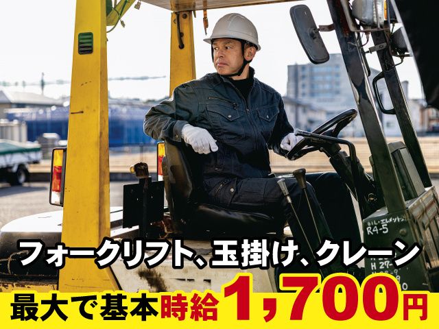 資格・経験 無資格の方もOK 以下いずれか免許をお持ちの方、時給UPします ・フォークリフト免許 ・玉掛け免許 ・クレーン免許