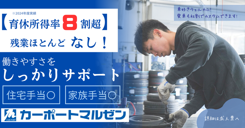 仕事内容 \\タイーヤマルゼン!タイヤマルゼン!ホイールマルゼン?// <<ホイールマルゼン!!!>>【あなたの合いの手募集中】 ▷車めっちゃ好きやねん!もう車ずっといじってたい! そんなあなたと一緒に働きたい。 あの有名CM「タイーヤマルゼン!タイヤマルゼン♪」でおなじみのカーポートマルゼンです。 未経験歓迎!【マジでチャンスです。】 未経験でも安心してスタートできる研修を用意しており、 クルマを「より安全に」「よりカッコよく」する技術をイチから学べます。 新しい生活をスタートするなら 今が、【マジでチャンスです。】 ───未経験からでも正社員!? 「整備士の資格もない」「車イジリ経験ゼロ」でも全然大丈夫。 入社後3ヶ月のOJT研修で、工具の持ち方から作業の流れまでイチから教えます! 《働きやすい環境!》 賞与年2回、昇給1回あり!! モデル年収:年収450万円/20代(入社3年) 残業ほぼなし! → 仕事後も車いじりや趣味の時間に 年間休日125日 → 車だけじゃなくプライベートも楽しめます 産休・育休制度あり 福利厚生:リロクラブ → 映画・ホテルなどお得 資格取得支援制度&資格手当(1〜4万円/月) 《仕事内容》 お客様の愛車をもっと快適に、もっとカッコよく仕上げるお手伝いです。 まずは簡単な作業からスタートして、少しずつ「車イジリの達人」レベルへステップアップ! ・タイヤ・ホイールの交換・取り付け ・サスペンション交換(車高調) ・バランス調整 ・作業の説明やお客様の相談に乗る接客 ・ピット内の安全管理・清掃 など 《キャリアパス》 希望に合わせたキャリアステップあり スペシャリストライン:技術を極めるピットの仙人コース マネジメントライン:チームをまとめるピットのボスコース 《関西圏以外にも支店展開中!》 大阪/東大阪/枚方/兵庫/埼玉 ※転居を伴う入社をされる方には引っ越し費用の一部を負担いたします! 《最後に》 好きなクルマに囲まれて働きながら、 「ありがとう」と直接言ってもらえるやりがいも感じられます。 あなたの“クルマ好き”を、ぜひマルゼンで活かしてみませんか? この求人を最後まで読んでくれたそこのアナタ!応募をお待ちしています!
