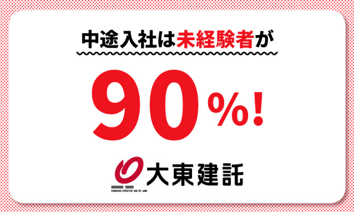 仕事内容 ▼この求人のここがPOINT ✨創業50年、売上高1兆円超えの東証プライム上場企業 ✨大東建託グループは賃貸住宅の供給・管理・仲介で業界No1のリーディングカンパニー! ✨2025年4月には、2年連続、全従業員の給与のベースアップを実施! ✨営業職(担当クラス)の平均年収879万円(2024年度実績) ✨誰でも狙える「新人賞」で初年度から大幅年収UP可能! ✨業界1位のノウハウが詰まった充実の研修制度でスキルUP可能! ✨年間休日125日! ✨誕生日や結婚記念日など特別な日に取得できるアニバーサリー休暇あり! ✨男性育児休業取得者100%、有給取得率80%以上! ✨フレックスタイム制度導入で働きやすい環境◎ 【仕事内容】 空き地や農地、駐車場、古借家などの土地を持つお客さまに、アパートや賃貸マンションの建築・運営を提案する営業です。一人のお客さまと何度もお会いして、交流し、信頼関係を深めていきます。 <仕事の流れ> step.01 訪問(初訪~再訪) 担当するエリア内のご家庭(土地オーナー様)のもとに定期的に訪問。 まずは世間話などをしながら、エリアの担当であることを知っていただきます。 少しずつ、距離を縮めていきながら、例えば「先祖代々から受け継いだ土地や建物をどうしたらいいか…」などのお悩みや困りごとを引き出していきます。 step.02 プラン策定・打合せ ヒアリングした内容を上司に報告。オーナー様の困りごとを解決するためのプランを一緒に考えます。 step.03 商談 考えたプランを持ってオーナー様のもとへと上司と一緒に訪問。 分からないことがあっても大丈夫。必ず上司が同行してフォローするので、安心して商談に臨めます。 step.04、ご契約 契約が完了して工事が始まってもオーナー様とのお付き合いは続きます。 工事が完了するまでサポート。「ありがとう」と言われる最高の瞬間がここにあります。 ★訪問できるお客様の数が増えれば増えるほど、確実に報酬UPの確率を上げることができる仕組み! オフィスにこもっているより、どんどん外にでて行動した方が結果を残しています。 【研修・育成体制】 ✅業界1位のノウハウが詰まった充実の研修制度 研修は入社後すぐにスタートし、本社と支店の両輪で実施。 年次や個人のスキルに合わせて、継続的に育成プログラムが組まれており、段階的な知識・スキルの装着が可能。 法律や国家資格取得に必要な知識も学ぶことができ、キャリアの幅が広がります。 ・導入研修:本社の教育選任トレーナーが名刺の渡し方から、税金・建築知識など基本的な知識のインプットをサポート ・営業研修:プラン提案力など地域別で毎月実施 ・事業部強化研修:地域特性を活かした情報インプットの定期実施 上記の他にも、年次や個人のスキルレベルに合わせた各種研修をご用意しております。 【頑張ったら頑張った分だけ収入UP可能】 営業で成果を上げれば上げた分だけ、しっかり収入に反映される仕組みがあります。 年2件の契約で年収1,000万円超えの例も・・・! 《例》契約金額1億円の案件(狙える歩合給:約200万円/概算)×年2回契約 また、歩合給の他に入社をすると誰でも狙える新人賞があります。入社後、経過した期間によって最大50万円支給。 自分の頑張り次第で、収入をいくらでも上げられる!頑張るモチベーションが続く環境があります。