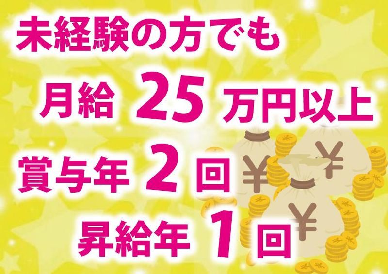 【保険制度】 雇用保険、労災保険、健康保険、厚生年金 待遇・福利厚生 【福利厚生】 ■昇給年1回(4月) ■賞与年2回(6月・12月) ■社会保険完備(雇用・労災・健康・厚生年金) ■交通費全額支給 ■時間外手当(超過分) ■出張手当 ■役職手当(班長2万円、主任3万円、副店長6万円、店長9万円、事業部長12万円) ■職能手当(1万円~) ■社員寮完備 1Kの社員寮(エアコン・Wi-Fi・冷蔵庫完備、水道料金会社一部負担)をご用意。家賃は3万9000円~です。 ■引越代補助(最大10万円) ■車通勤可(応相談) ■各種スキルアップ研修 ■健康診断・予防接種の費用会社負担 ■スタンプ特典(50個で1万5000円支給) └研修・健康診断等に参加で社内のスタンプを付与!さまざまな場面で貯められます! ■リファラル制度 ■褒賞 社長賞(昇給2号俸+賞金10万円) 優秀社員賞(昇給1号俸+賞金5万円) 永年勤続表彰(5年3万円、10年8万円、以降10年毎に10万円) 特別賞(賞金3万円)
