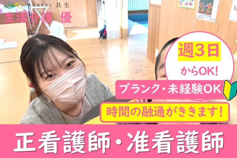 【応募資格】 ●いずれかの有資格者 ・正看護師 ・准看護師 ●皆さん大歓迎です ・現場経験からブランクがある方 ・介護施設や障害福祉施設での経験がない方 ●普通自動車運転免許(AT限定可) ※送迎対応可能な方のみ 【BOXID-共求】 【メリット】 #ブランクOK #40代も応募可 #50代も応募可 #車通勤OK #交通費支給 #残業なし #経験者歓迎 #昇給あり #賞与あり #副業・WワークOK #平日のみOK #主婦・主夫歓迎 #扶養内勤務OK #週2・3日からOK #土日祝のみOK #シフト自由 #新卒歓迎 #第二新卒歓迎 #未経験者歓迎 #有資格者歓迎 #学歴不問 #社会保険完備 #社員登用あり #資格取得支援あり #育休制度あり #育児サポートあり #60代も応募可 #バイク通勤OK #制服貸与