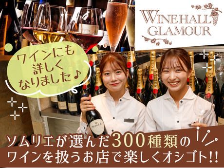 仕事内容 【ホールスタッフのお仕事】 ・席へのご案内 ・注文取り ・料理運び など。 まずは明るい挨拶ができればOK! 他のスタッフと協力しながら、 お客様にとって居心地の良い空間を 一緒に作っていきましょう。 【未経験でも安心のワケとは?】 先輩達の多くが未経験スタート! 初めてで不安...な気持ちがよ~くわかります。 だから、 挨拶の基本~メニューまで 優しく丁寧に指導するのはもちろん、 お仕事中も先輩スタッフが近くにいて、 困った時はすぐフォローします! 【WINEHALL GLAMOUR】 ソムリエが選んだ300種のワインと 相性のよい料理のマリアージュをお楽しみいただける ガブ飲み系ワインホールです。