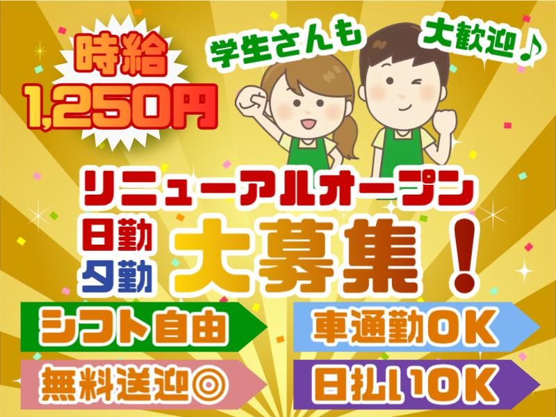 職場環境 頼りになる当社の先輩スタッフ達がいるので、困った時も安心! 分からない事も気軽に聞ける環境なので、 未経験の方でも安心して働けます♪、 主婦(夫)・学生・フリーター… 幅広い年代が活躍中! みんな優しい方ばかりなので、 すぐに馴染めますよ♪ 喫煙所:喫煙所あり(屋内) 施設内に完全分煙の喫煙ルームを設置しています。 作業エリアとは明確に分かれており、換気設備も整っているため、煙やにおいが広がる心配はありません。 休憩時間に喫煙可能で、喫煙者・非喫煙者ともに安心して働ける職場環境です。