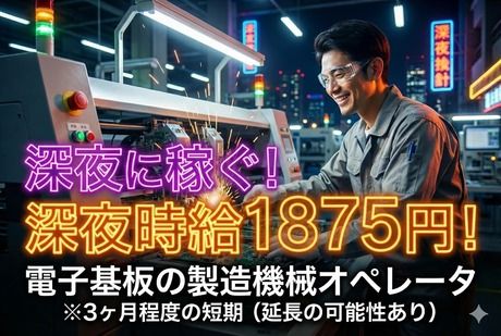仕事内容 ■未経験でもしっかり稼げる!電子基板の製造機械オペレーター スマホや家電などに使われる、電子基板をつくる機械のオペレーション業務です。 主に以下のような業務をお任せします。 ・機械へ部材セット ・ボタン操作・機械の稼働チェック ・完成品の目視検査 ※難しい作業はありません! ※未経験の方でも丁寧に教えてもらえる環境です。 3ヶ月程度の短期のお仕事です! ※期間延長の可能性もあり 【おすすめポイント】 ◎夜勤の高時給でガッツリ稼げる! ◎短期でサクッと稼げる! ◎未経験OK!丁寧な研修あり ◎空調完備の快適な工場 ◎モクモク作業が好きな方にピッタリ