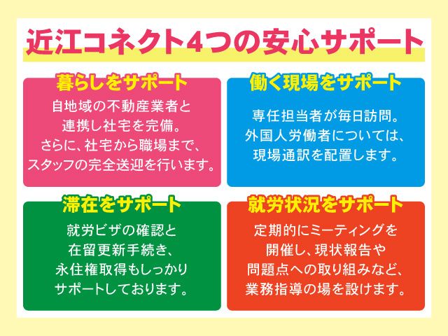 仕事内容 甲賀市甲南町にあります工場にて 加工スタッフを募集しています。 「未経験から始められる仕事をお探しの方」 「日勤&土日休みの仕事をお探しの方」 「寮完備を希望の方」 そんな方にオススメの求人です 〈おすすめポイント〉 ━V━━━━━━━━━━━━━━ ▶経験不問!未経験スタート多数在籍 ▶年齢不問!幅広い年代の方が活躍 ▶残業なし!男女ともに活躍中 ▶日勤+土日お休み! GW・夏季・年末年始休暇もあり ▶工場見学随時受付中 ━━━━━━━━━━━━━━━━ 【主な業務内容】 〇電線ケーブルの切り取り作業 〇簡単な機械加工 機械の操作方法なども 一から丁寧に教えます。 サポート体制万全で工場で働くのが 初めての方も安心です。 <土日休み・残業なしでプライベート充実> 日勤のみ・残業なしで プライベートと両立も安心の環境です。 GW・夏季・年末年始休暇もあり メリハリを持って働けます。 少しでも気になりましたら まずはお気軽にお問い合わせください。 (採用サイト)https://entori.jp/omiconnect ──────────────────── 弊社は、地域密着をモットーに 働く環境に笑顔を創ることに重点を置いた 環境づくりに努めています。 「暮らし」「働く現場」「滞在」 「就労サポート」の4つの安心サポートより 教育から生活面までフルサポートを行い、 安心して働いていただける環境を 提供しております。 ────────────────────
