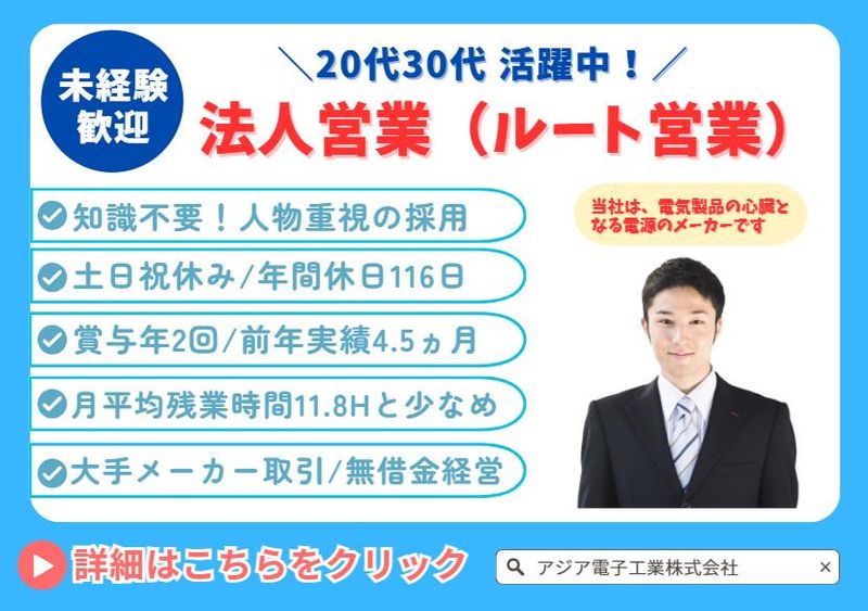求めている人材 ✨営業未経験・業界未経験歓迎!✨ (電源知識がなくてもOK) <必須条件> なし <歓迎条件> ■挨拶ができる方 ■明るい対応が出来る方 ■人と話すことが苦ではない方 ■人の話を聞くことが好きな方 ⭐こんな方も大歓迎!  ̄ ̄ ̄ ̄ ̄ ̄ ̄ ̄ ̄ ̄ ̄ ̄ ̄ ̄ ̄ ̄ ・営業経験がある方 ・長く安定して働きたい方 ・経験を活かしてキャリアアップしたい方 ・電子機器業界での経験を積みたい方 【ご経験業界は不問!】 個人営業、法人営業、ルート営業、 商社営業、食品営業、保険営業、 金融、百貨店、アパレル、食品、メーカーなど 販売職のご経験があれば出身業界は不問です。 ご経験を活かしてステップアップの転職を ご希望の方はぜひご応募ください! ※携帯販売、ブライダル業界の方も弊社とは親和性が高いです 年齢の条件と理由:あり(例外事由1号・60歳未満(定年のため))