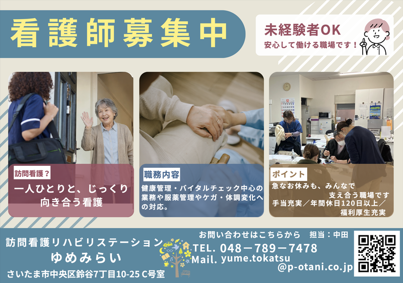仕事内容 -\\ 求人のおすすめポイント //- ⭐年間休日120日以上 ⭐時短勤務制度あり ⭐入社祝い金10万円あり!(規定有) ⭐資格取得支援・手当あり! ⭐残業ほぼなし! ⭐産休・育休・介護休暇取得実績有り ┏━━━━━━━━━━━━━━━━━━┓ *・*・ 業務内容 ・*・* ┗━━━━━━━━━━━━━━━━━━┛ ◆訪問看護師としての業務全般を お願いします。 〈 具体的には・・・ 〉 ✅健康管理・服薬管理 ✅医療的処置 ✅入浴等保清の援助、緩和ケア ✅家族への介護指導 ✅利用者様に関わる情報の交換 ✅連携記録・報告書等の作成 ◆社用車または電動自転車を使用しての 訪問となります。 ┏━━━━━━━━━━━━━━━━━━┓ *・*・ 当社の魅力 ・*・* ┗━━━━━━━━━━━━━━━━━━┛ ✨訪問看護未経験でも安心  ̄Ⅴ ̄ ̄ ̄ ̄ ̄ ̄ ̄ ̄ ̄ ̄ ̄ ・訪問看護の経験は一切不問! 特定看護師や経験豊かな先輩からの 同行指導を受けながら、安心して スタートできる環境を整えています。 ・訪問看護初任者研修にもご参加いただき、 必要なスキルをしっかり身につけて いただけます。 ✨働きやすい環境  ̄Ⅴ ̄ ̄ ̄ ̄ ̄ ̄ ̄ ・残業はほぼナシ、年間休日120日以上! 産休・育休、お誕生日休暇など 充実した休暇制度を設けています。 ・休日もしっかりと取得でき、 仕事も私生活も大切にしたい方には ピッタリの環境です。 ✨キャリアパス  ̄Ⅴ ̄ ̄ ̄ ̄ ̄ ̄ ・定行為研修受講の支援制度があり、 制度を利用して高度な医療知識を 学ぶ機会をご用意しています。 ┏━━━━━━━━━━━━━━━━━━┓ *・*・ 先輩インタビュー ・*・* ┗━━━━━━━━━━━━━━━━━━┛ Q1:当社への転職のキッカケは?  ̄ ̄ ̄ ̄ ̄ ̄ ̄ ̄ ̄ ̄ ̄ ̄ ̄ ̄ ̄ ̄ 以前は病院で勤務していましたが、 子供が産まれ、家族との時間も大切に したいという想いから転職しました。 Q2:実際に業務に携わってどうですか?  ̄ ̄ ̄ ̄ ̄ ̄ ̄ ̄ ̄ ̄ ̄ ̄ ̄ ̄ ̄ ̄ ̄ ̄ ̄ 訪問看護の経験はありませんでしたが、 同じような境遇の先輩スタッフも多く、 不安はすぐになくなりました。 子育ての悩みを聞いてもらったり 相談し合ったりすることもあります。 Q3:この仕事の魅力は?  ̄ ̄ ̄ ̄ ̄ ̄ ̄ ̄ ̄ ̄ ̄ ̄ 訪問看護の魅力は、 入院することを未然に防ぐことのできる 本質的な看護であることです。 病状が悪化しないための看護が できる点に、とてもやりがいを感じます。 また、オンコール・休暇等のシフトは 相談できる環境が整っているため お休みを取りやすいところも魅力です。 ┏━━━━━━━━━━━━━━━━━━┓ *・*・ 当社について ・*・* ┗━━━━━━━━━━━━━━━━━━┛ 私たちは、利用者様の在宅療養生活を 支援する訪問看護ステーションです。 利用者様お一人おひとりの想いに寄り添い、 住み慣れた場所で「その方らしい日常」を 支えること。 それが私たちの役割です。 時間に追われがちな病院勤務とは異なり、 目の前の利用者様とじっくり対話できるのが 訪問看護の良さ。 「一人の人間として向き合う」という、 看護の原点に立ち返った働き方を、 ここで叶えてみませんか。