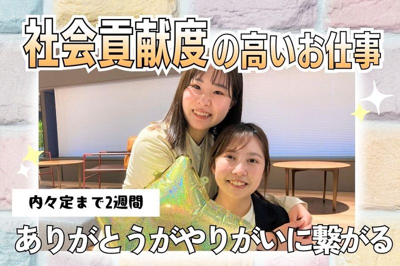 求めている人材 【歓迎条件】 ・未経験歓迎 ・第二新卒活躍中 ・経験・資格一切不問 ・フリーター歓迎 ・学歴不問 ・ブランク歓迎 ・ハローワークでお仕事をお探しの方も歓迎! 【歓迎するタイプ】 ・日本語での円滑なコミュニケーション能力 ※接客対応が発生するため ※以下の条件を満たす方 ※日本語能力検定N1レベル、または同等の会話力をお持ちの方 ・就労制限のない在留資格をお持ちの方(永住者/日本人の配偶者等/永住者の配偶者等/定住者/特別永住者) 【こんな方にオススメ!】 ・正社員として働きたい方 ・コミュニケーションに自信がある方 ・⼈と話すのが好き ・スマホ操作やアプリなど使い慣れている⽅ ・⼈のサポートをしたり、教えるのが好き ・新しい事にチャレンジしてみたい ・接客経験を活かして新しい業界に挑戦したい ・モクモクと作業を行うお仕事が好き ・社会貢献度の高いお仕事がしたい ・ITや最新技術、専門性の高いお仕事に挑戦したい ・ワークライフバランスが充実した仕事がしたい ・異業種出⾝でも活躍できる職場で働きたい