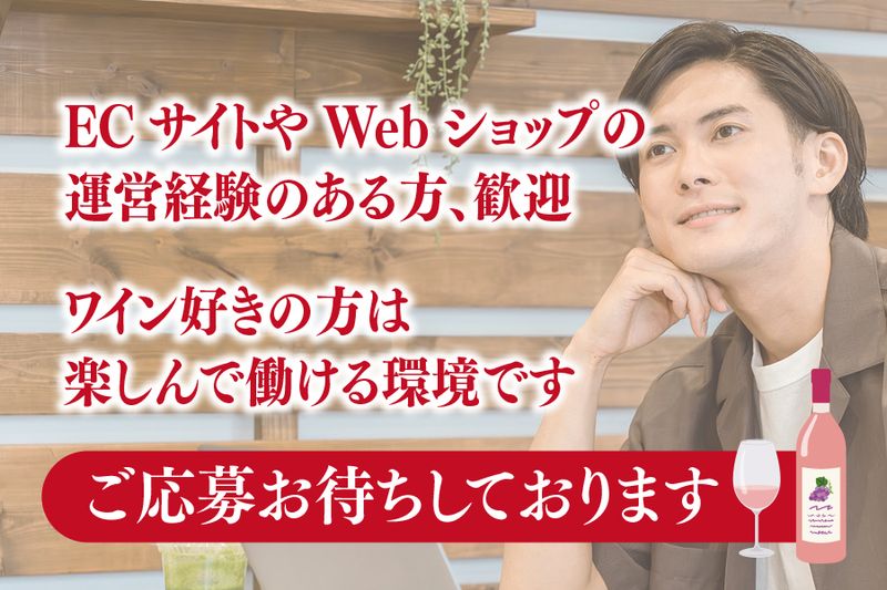 応募資格 職種・業種未経験OK! <必須要件> 35歳までの方(長期的雇用によるキャリア形成のため) 入社後にJ.S.A.認定ワインエキスパート又はソムリエの資格取得の意向のある方 <歓迎要件> ECサイトやWebショップの運営経験のある方 J.S.A.認定ワインエキスパート、ソムリエの資格をお持ちの方 <こんな方に向いています> ・ワインが好きな方、勉強したい方 ・ワインを通じて人々を幸せにしたい方! ・ECサイト構築・運営もお好きな方 ・Instagramが好きな方