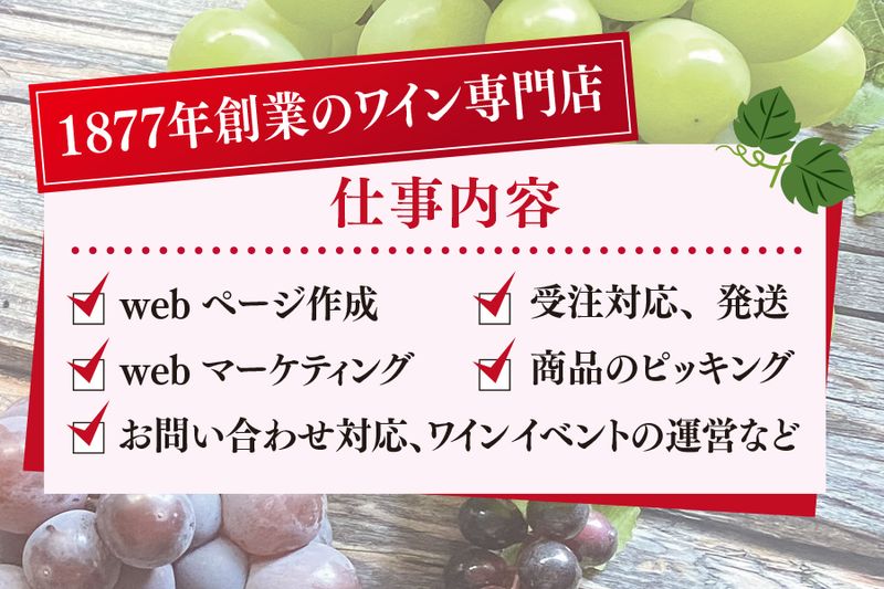 仕事の内容 【当社の魅力】 ◎明治創業の歴史ある京都の老舗企業。 国内外に多くのファンを持つ名店 ◎資格を活かして、業界で活躍できる プロへと成長できる環境があります ◎世界トップレベルの ワインソムリエ講師による 講習会、海外研修もあり ◎ワインの研修・勉強会はしっかり行います。 安心して成長できる環境です。 ◎年間休日128日 (完全週休二日制・GW・夏季休暇・年末年始・有給など) ◎入社時想定年収342万円! 賞与は将来的には年5~6ヶ月分を予定! 頑張り次第でしっかり稼げます。 ◎全国から応募OK! 遠方の方はオンライン面談を行っています。 ☆当社の採用サイトを是非ご覧ください!☆ https://site1.saiyo-dekirukun.com/winegrocery 【人間関係が良さが自慢の職場です】 正社員は16名在籍しており、みんなワインが大好きで、 楽しみながら学び、お客様にその魅力を伝えています。 社内では思いやりやチームワークを 大切にする勉強会もあり、 困っている人には自然と「大丈夫?」と声がかかる、 あたたかい雰囲気が根づいています。 【仕事内容】 運営しているワインショップでの オンラインショップ部門の業務をお任せします。 【具体的な業務内容】 ・webページ作成 ・webマーケティング ・インスタ運用 ・受注対応 ・商品のピッキング ・発送 ・お問い合わせ対応など ・ワインイベントの運営 スタッフの仕事内容を詳しく説明しています!ぜひご覧ください https://www.winegrocery.com/blog/blog-4168-2-2/ 【「好き」を本物に。未経験からプロを目指せる環境です】 入社後は基礎から丁寧に学べる 研修制度や勉強会が充実しており、 実際に未経験から1年でソムリエ資格を取得した社員もいます。 わからないことがあれば先輩社員がしっかりサポート。 着実に成長できる環境で、あなたの「好き」をキャリアに変えてみませんか? 【充実の研修制度でプロフェッショナルへ】 世界のワインを学ぶ、圧倒的な成長環境 ◎世界トップレベルのワインの プロフェッショナルやソムリエ講師による、 実践的かつ本格的な研修を実施 ◎シャンパーニュ、ブルゴーニュ、イタリア、 ニュージーランド、アメリカなど、 各国の生産者を招いた特別講義・試飲研修も随時開催 ◎一度に30~40種類の高品質ワインを試飲する機会もあり、 幅広い知識とテイスティング経験が積める (※飲み込まずに行うため、アルコールに強くなくても安心です) ◎一定条件を満たした人には フランス・ブルゴーニュなどへの 海外研修もあり、本場のワイナリーや 産地を肌で感じながら深く学べるチャンスも ■最後に… 当社は、明治時代に京都で創業した、 歴史あるワイン専門店です。 「ワインを通じて人々を幸せにする」 という想いのもと、世界中の生産者が大切に育てた “本物のワイン”を、お客様へ丁寧にお届けしています。 実際に、未経験からスタートし、 学びを重ねたプロが多数活躍しています。 扱うワインも、お客様も、学べる内容もどれもが本格的。 だからこそ、やりがいは十分です。 遠方の方には「Web面接」も実施しておりますので、 全国からお気軽にご応募ください。